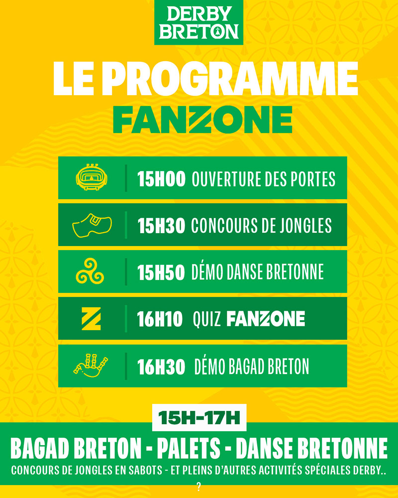 Le 20 septembre prochain, quoi de mieux qu'un derby pour transformer la Beaujoire en fief breton ! Venez vous amuser, danser et vous désaltérer au rythme d'activités typiques. Nantes vs Rennes : Qui a l'âme la plus bretonne ? Vous nous direz !