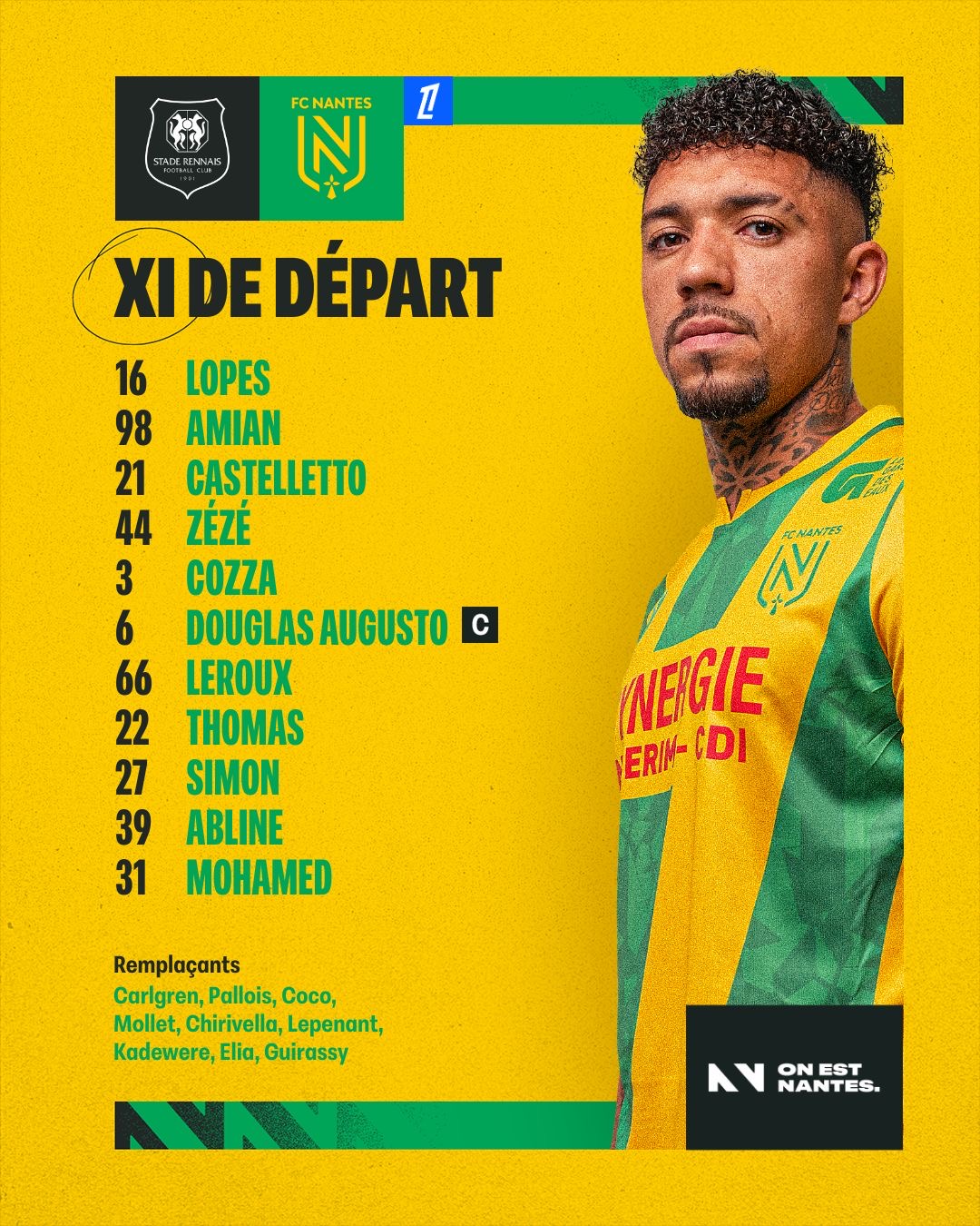 | Face au 3-5-2 rennais, les Canaris sont organisés en 3-4-3 : Lopes - Amian, Castelletto, Zézé - Thomas, Douglas Augusto (c), Leroux, Cozza - Abline, Mohamed, Simon |