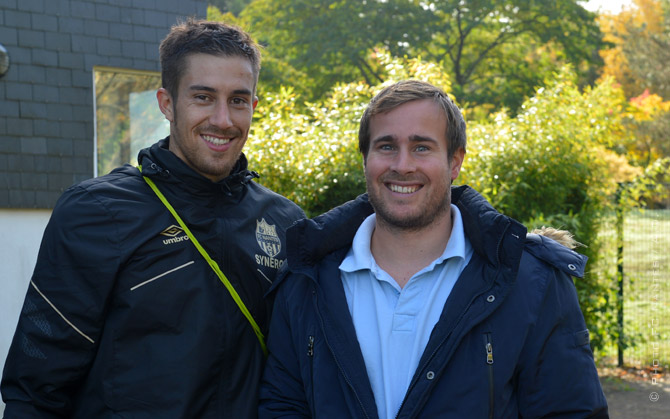 François Morvan en compagnie du capitaine de la CFA du FC Nantes, Jérémy Le Sourne. L'occasion pour le défenseur central originaire d'Hennebont (Morbihan) d'échanger sur les prochains défis du navigateur vannetais.