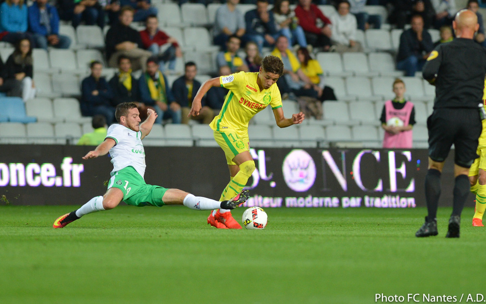 Tout un symbole? Amine Harit aux prises avec Jordan Vérétout lors du Classique à la Beaujoire face à l'AS Saint-Etienne.