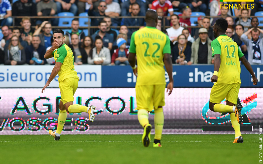 Le FC Nantes s'est imposé dans le cadre de la 7ème journée de L1 Conforama sur la pelouse du RC Strasbourg (1-2). Menés au tableau d'affichage après dix minutes de jeu et un but de Nuno Da Costa, les coéquipiers de Léo Dubois ont inversé le cours du match. Adrien Thomasson a égalisé d'une frappe en pivot imparable (13e : 1-1) avant que le capitaine ne montre lui-même le chemin de la victoire d'une lumineuse frappe (24e : 1-2). Retrouvez les images de la victoire des "Jaunes-et-Verts" soutenus par une belle colonie de supporters venus en Alsace pour assister à la troisième victoire du FC Nantes en déplacement ! #AllezFCNantes