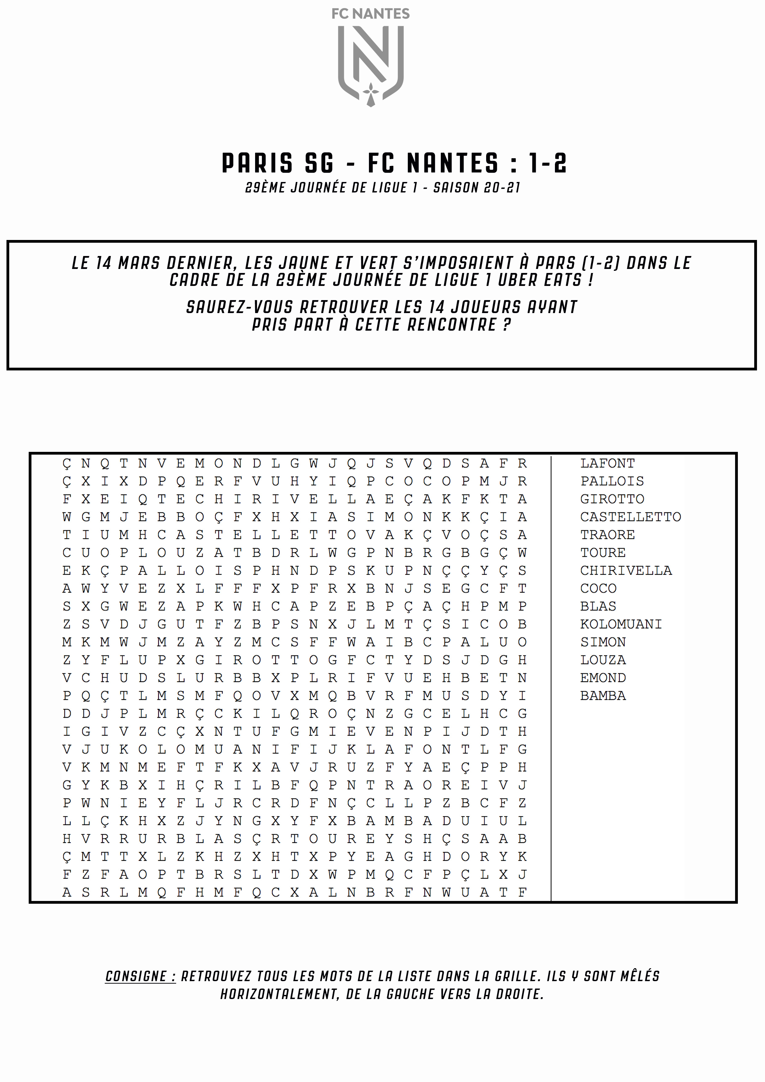 Le FC Nantes vous propose de découvrir les mots mêlés de ce dimanche ! Et aujourd'hui, ce sont les plus jeunes qui sont à l'honneur avec une grille qui nous emmène à Paris, un soir de mars 2021. #AllezNantes