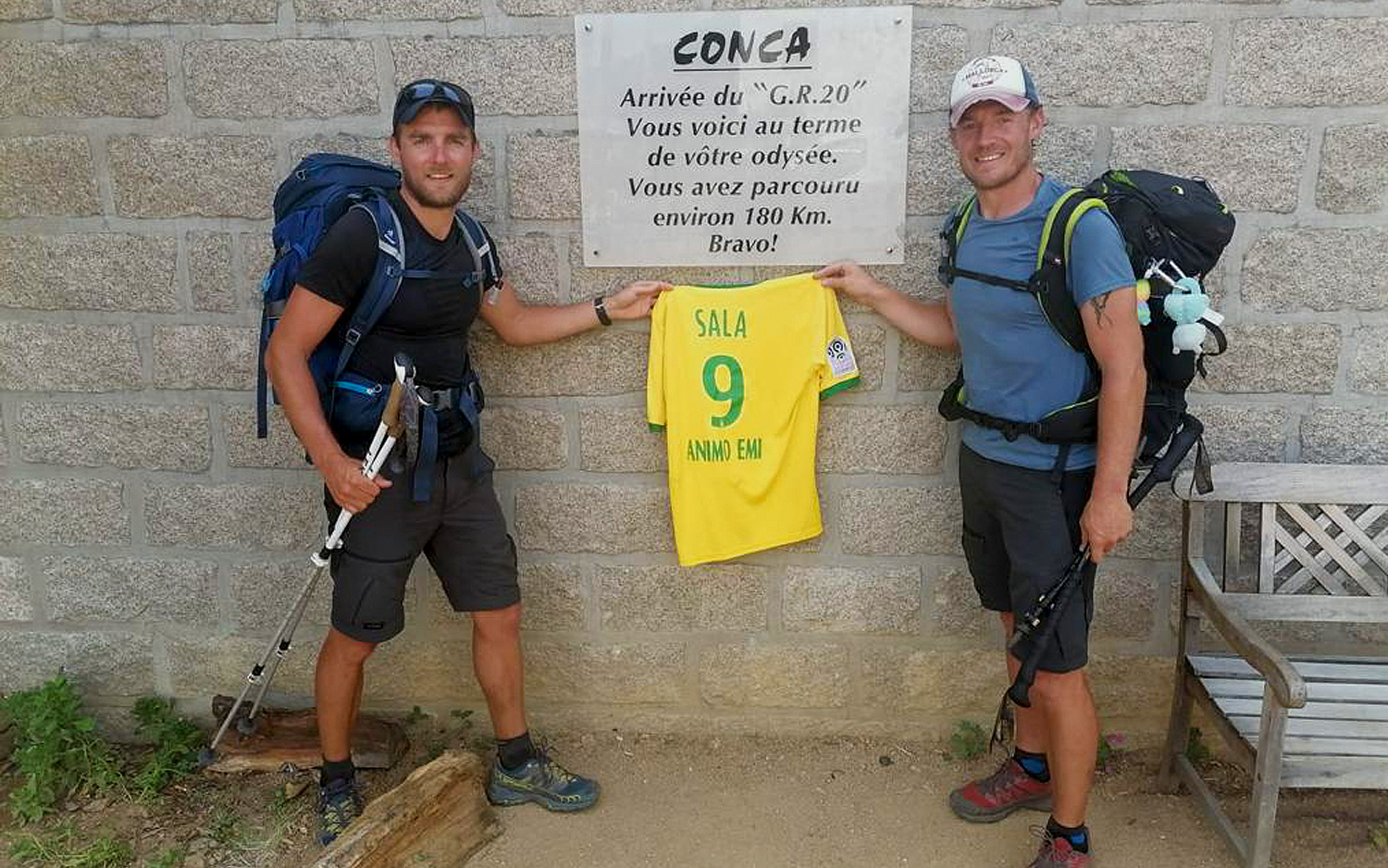 Comme ces deux supporters du FC Nantes, maillot d'Emiliano Sala dans les mains et présents à Conca (Corse) à l'arrivée du mythique sentier de randonnée du GR-20, faites rayonner le FC Nantes !
