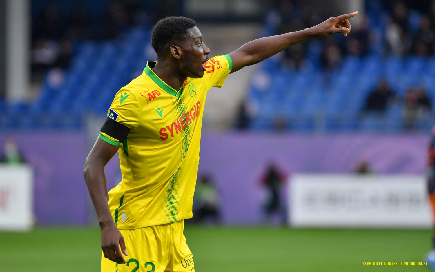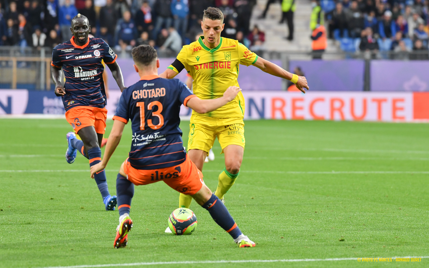 Le FC Nantes s'est incliné sur la pelouse de Montpellier HSC dans le cadre de la 12ème journée de L1 Uber Eats (2-0). Développants un jeu offensif dès les premières minutes de jeu, les coéquipiers de Marcus Coco (photo en une) n'ont pas réussi à trouver la faille malgré de nombreuses opportunités... Un réalisme qui ne fuyait pas les locaux. Florent Mollet (64e) et Elye Wahi (71e) trouvaient le chemin des filets d'Alban Lafont en seconde période pour faire basculer la rencontre. fcnantes.com vous propose de revenir en images sur le match durant lequel les Jaunes-et-Verts ont rendu hommage à la mémoire de Sidi Kaba en portant un brassard noir.
