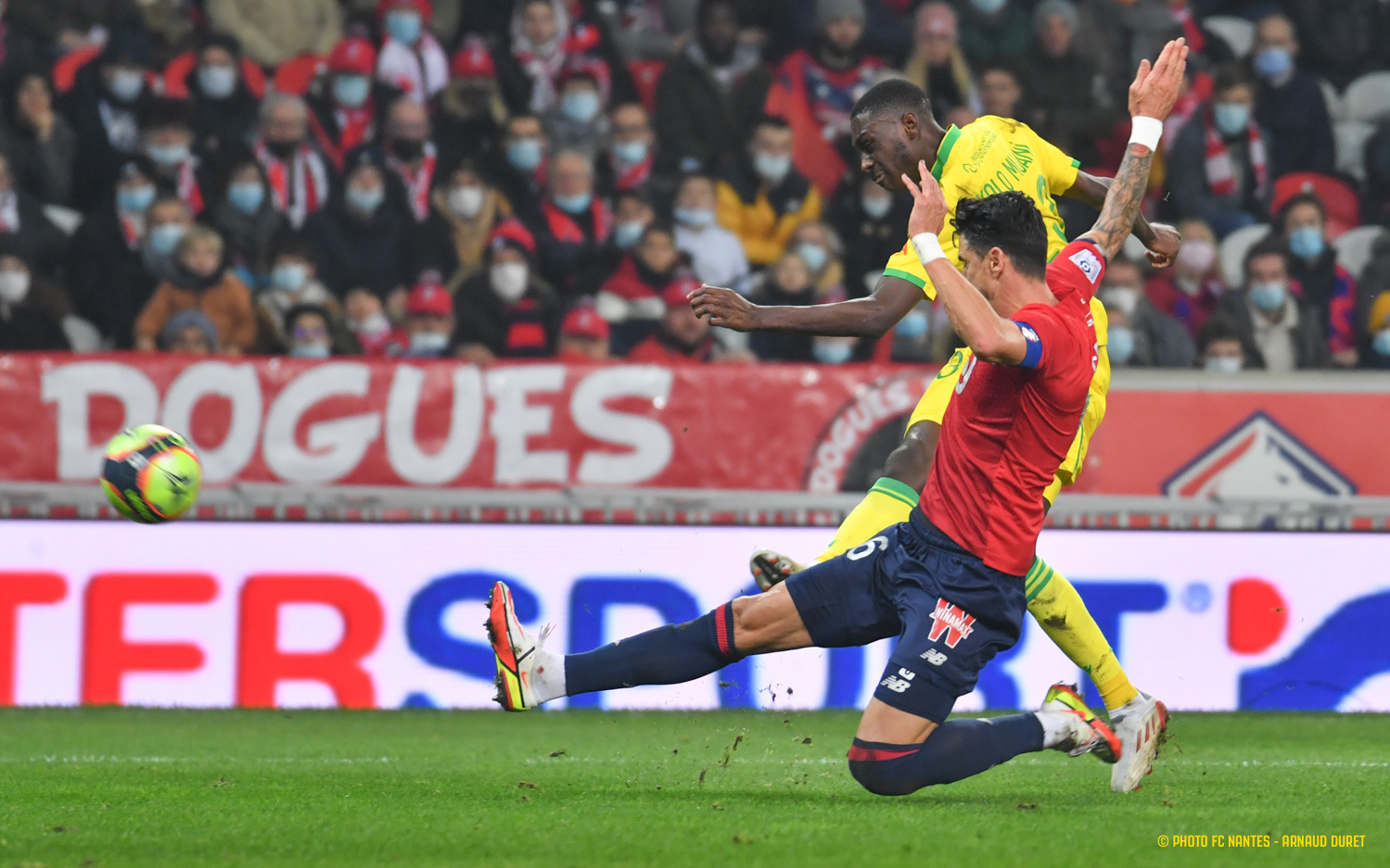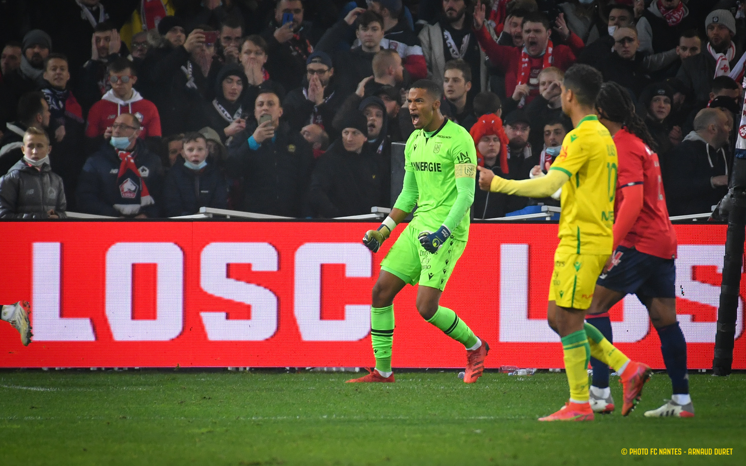 Le FC Nantes a obtenu le partage des points sur la pelouse du stade Pierre-Mauroy à Lille (1-1). Ludovic Blas répondait en première période (24e) à l'ouverture du score de Burak Yilmaz dès la 9ème minute. Solidaires et réduits à dix suite à l'exclusion de Fabio (78e), les Nantais ont défendu bec et ongles le point du match nul à l'image d'Alban Lafont, auteur d'une magnifique parade sur un penalty tenté par le meilleur réalisateur de L1, Jonathan David. fcnantes.com vous propose de revenir en images sur la rencontre durant laquelle les Jaunes-et-Verts étaient soutenus par près de 200 fans.