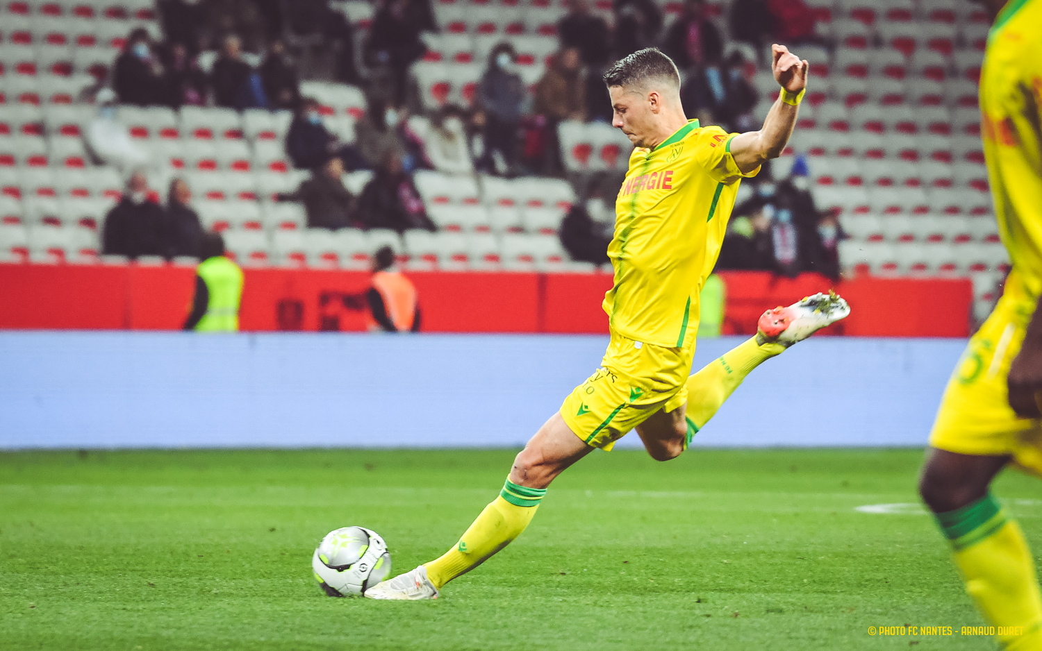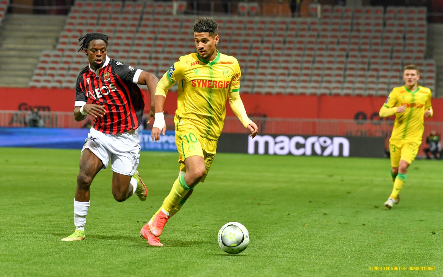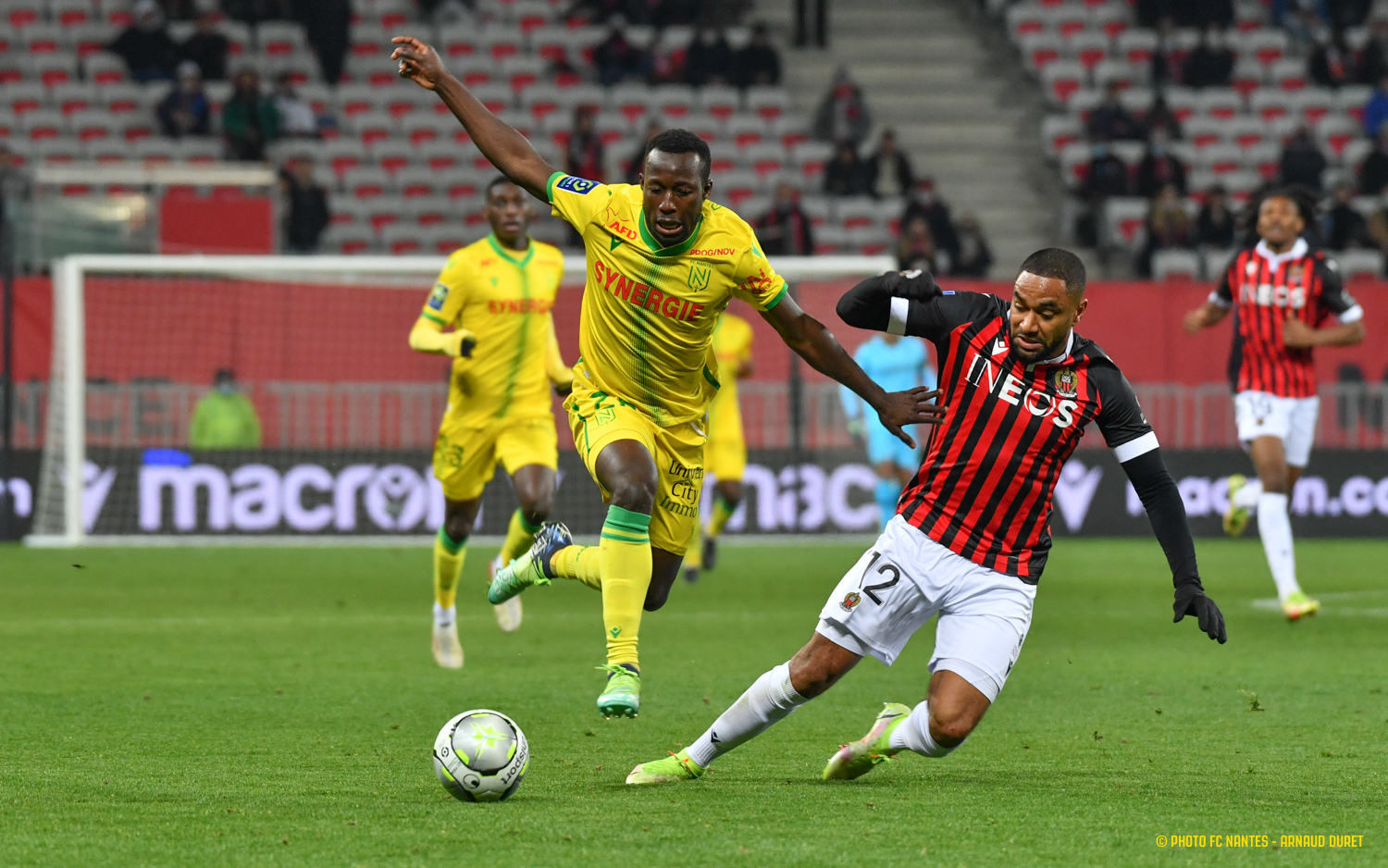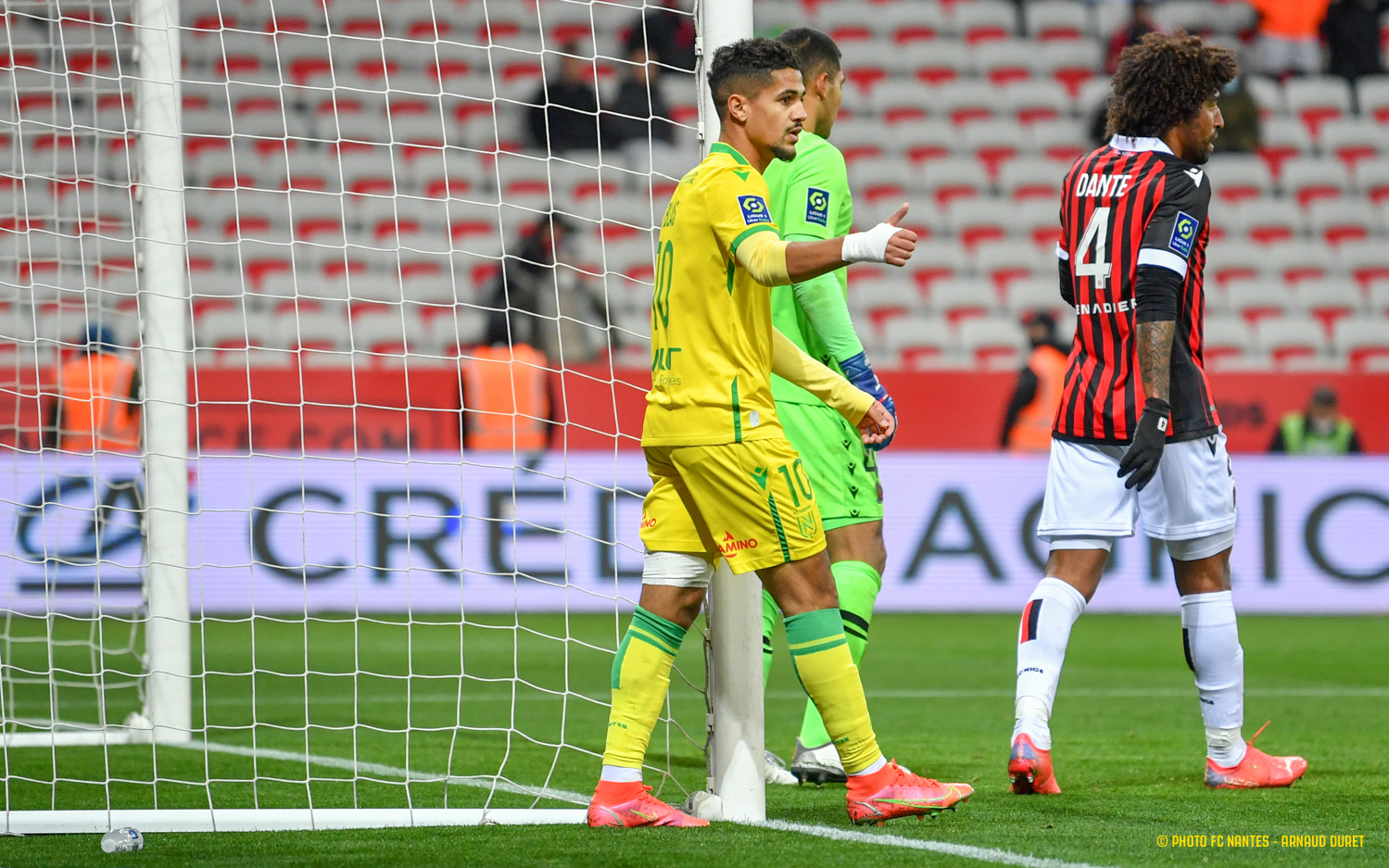 En lever de rideau de la 21ème journée de L1 Uber Eats, le FC Nantes s'est incliné à l'Allianz-Riviera face à l'OGC Nice (2-1). Les joueurs d'Antoine Kombouaré, menés dès la 21ème minute de jeu sur un penalty de Kasper Dolberg, parvenaient à recoller avant la pause grâce à un coup-franc puissant d'Andrei Girotto (45e). Une égalisation malheureusement vaine pour les Jaunes-et-Verts qui se faisaient surprendre par une percée de Khéphren Thuram (56e). Malgré la mainmise sur les vingts dernières minutes de la rencontre, les Nantais ne parvenaient pas à trouver le chemin des filets et voyaient leur belle série en L1 s'interrompre. fcnantes.com vous propose de revenir en images sur la rencontre à laquelle ont participé Abdoulaye Sylla, Yannis M'Bemba et Jean-Kevin Augustin.