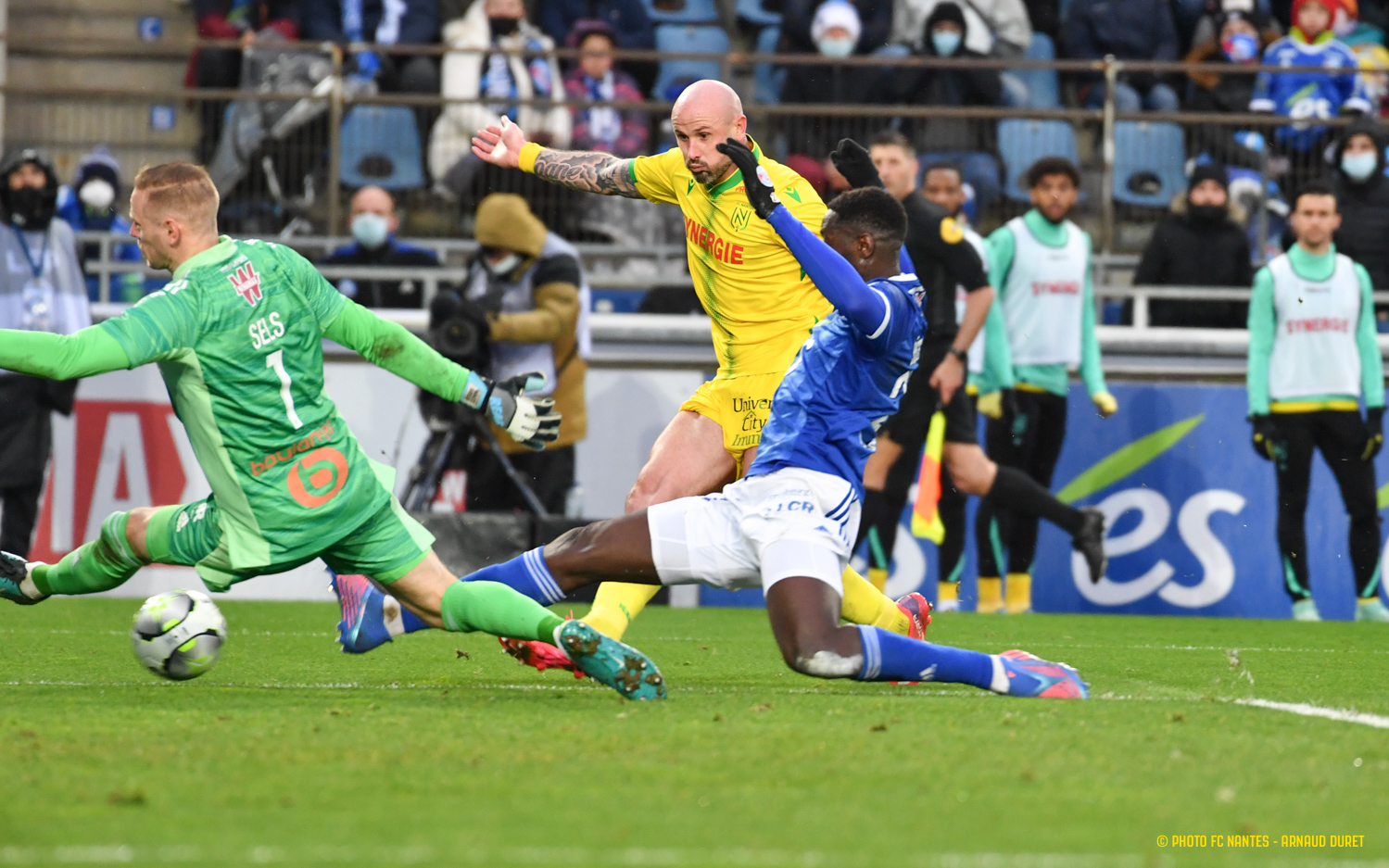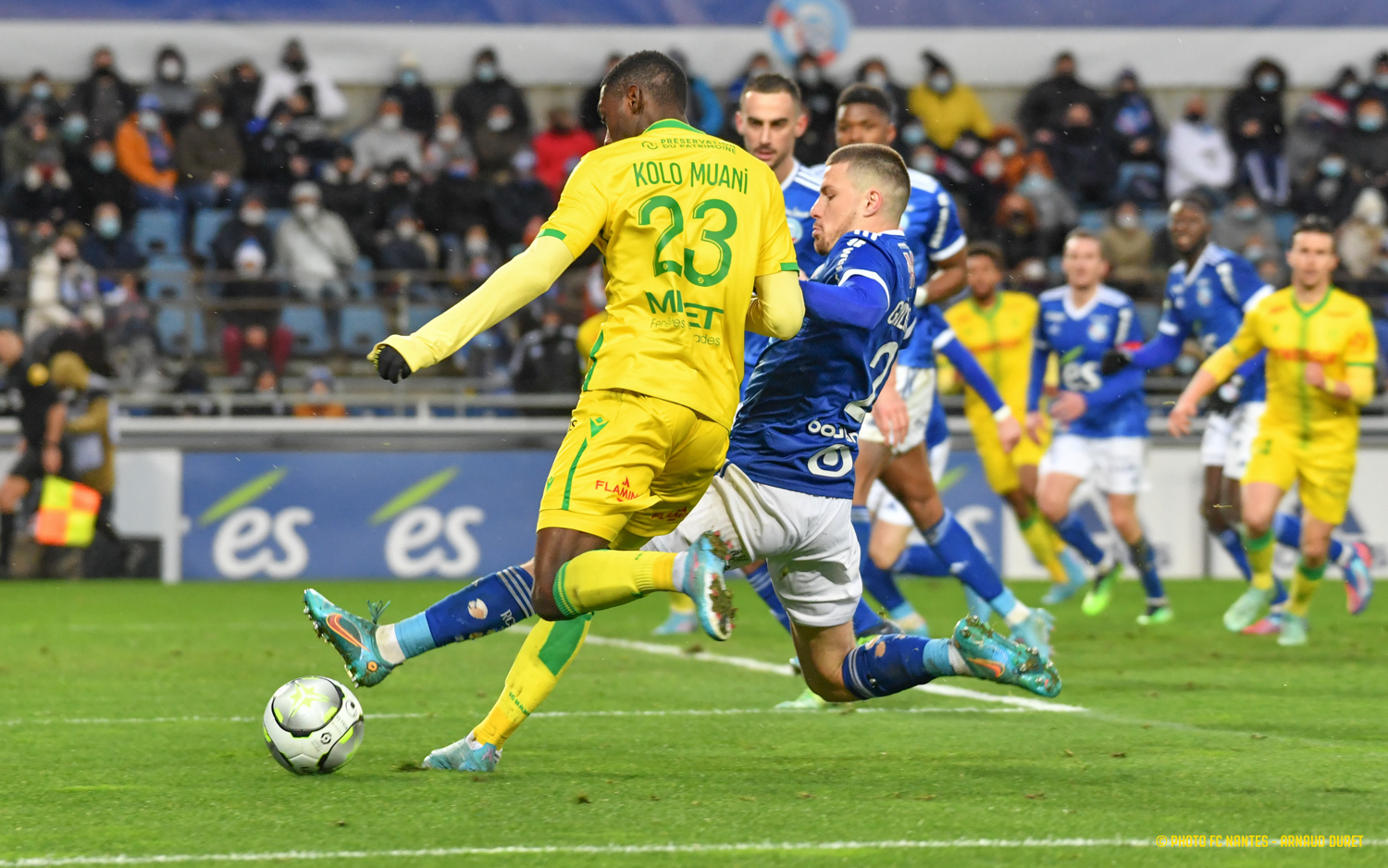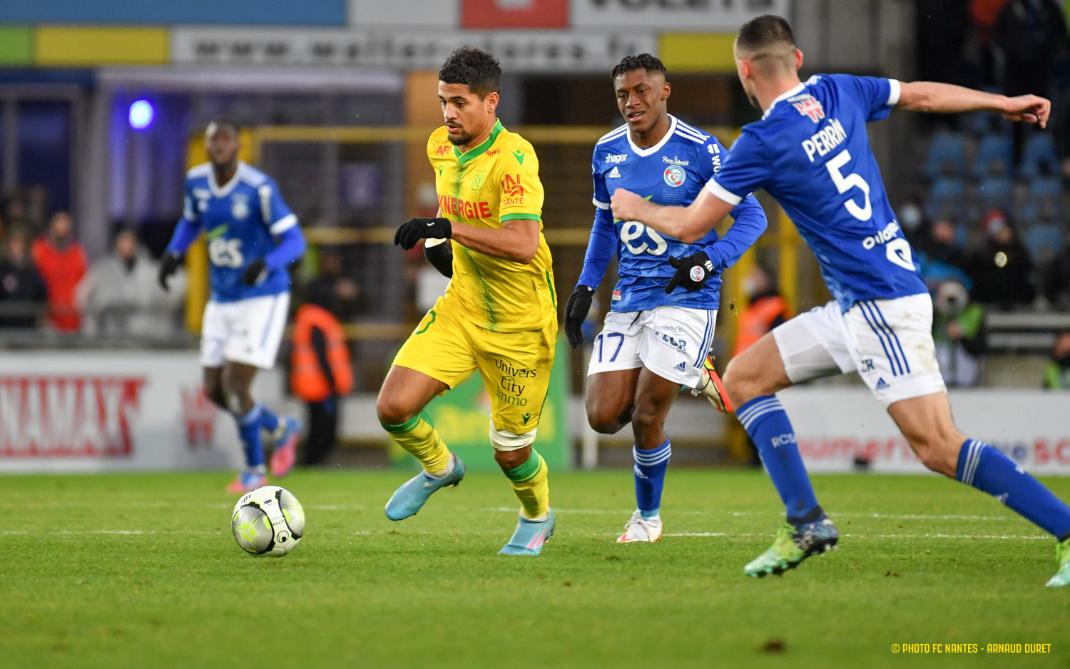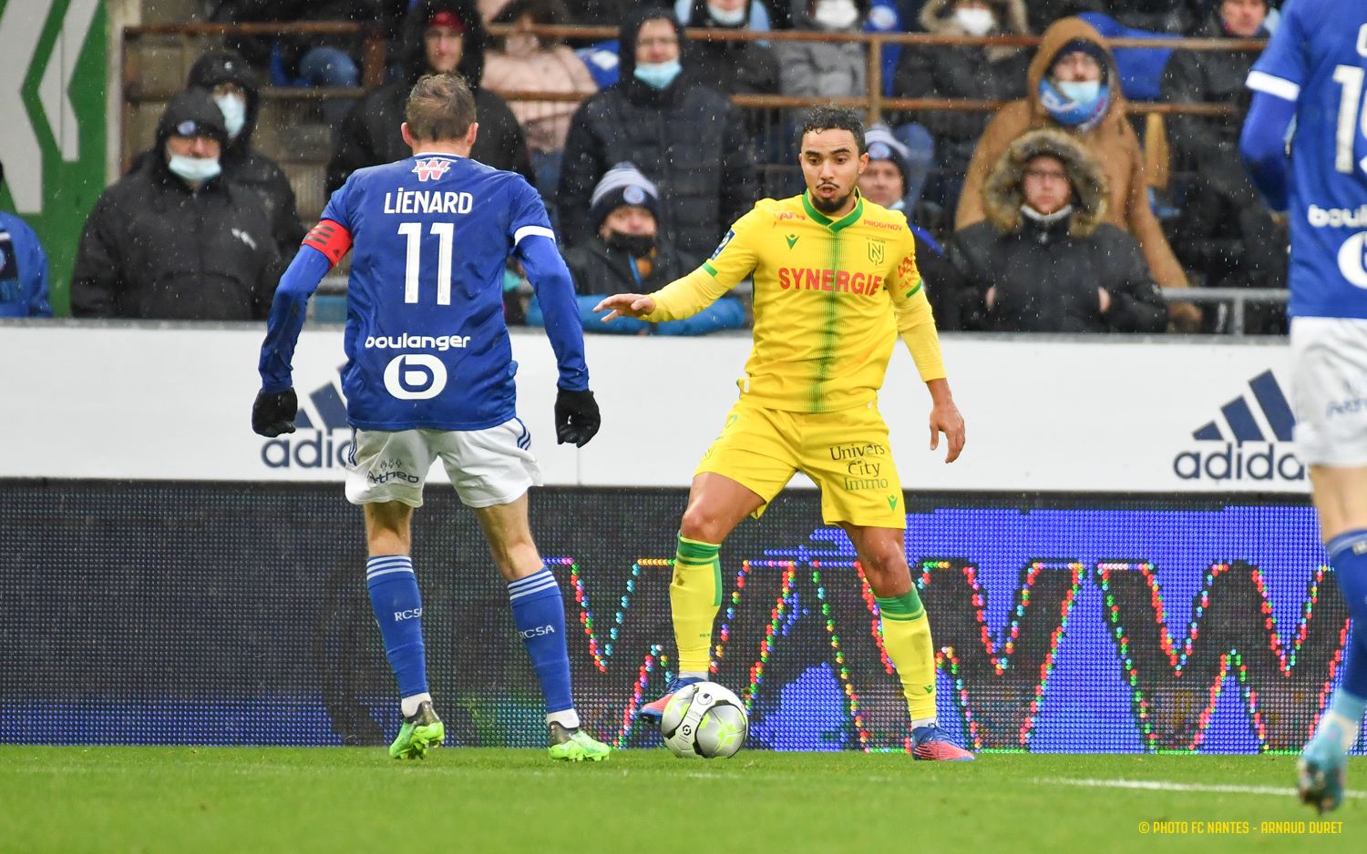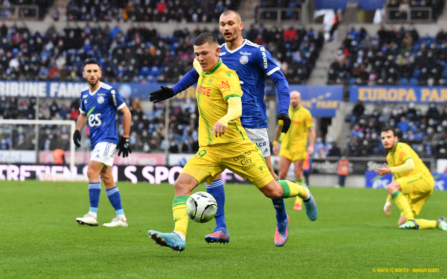 Les coéquipiers de Ludovic Blas (photo en une) se sont inclinés à la Meinau face au Racing Club de Strasbourg (1-0). Dimitri Liénard, opportuniste en fin de match, a réussi à trouver le chemin des filets d'Alban Lafont (74e). Une réalisation qui permettait au RC Strasbourg de forcer la décision au terme d'une rencontre intense et disputée. fcnantes.com vous propose de revenir en images sur la rencontre durant laquelle les "Jaunes-et-Verts" étaient soutenus par près de 200 fans.