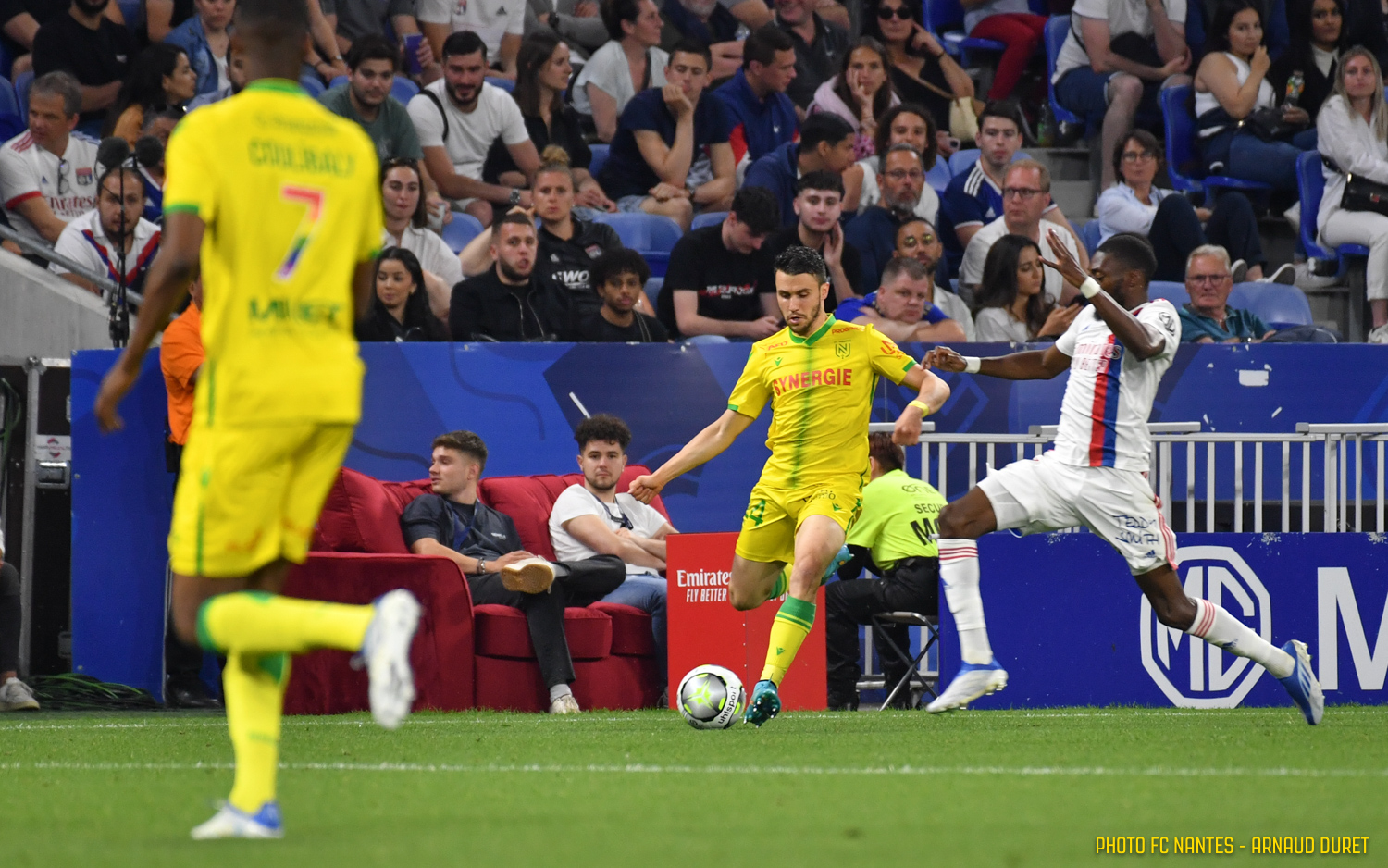 Les Jaunes-et-Verts ont chuté sur la pelouse du Groupama Stadium lors de leur dernier déplacement de la saison (3-2). Si les coéquipiers d'Alban Lafont ont tenté de recoller au tableau d'affichage grâce à Quentin Merlin (81e) et Wylan Cyprien (90e+3). Les Gones ont toujours mené au score suite à des réalisations de Moussa Dembelé (9e), Lucas Paqueta (78e) et Tetê (85e). fcnantes.com vous propose de revenir en images sur le dernier déplacement de la saison 2021-2022 durant lequel les Nantais bénéficiaient du soutien de 150 fans.