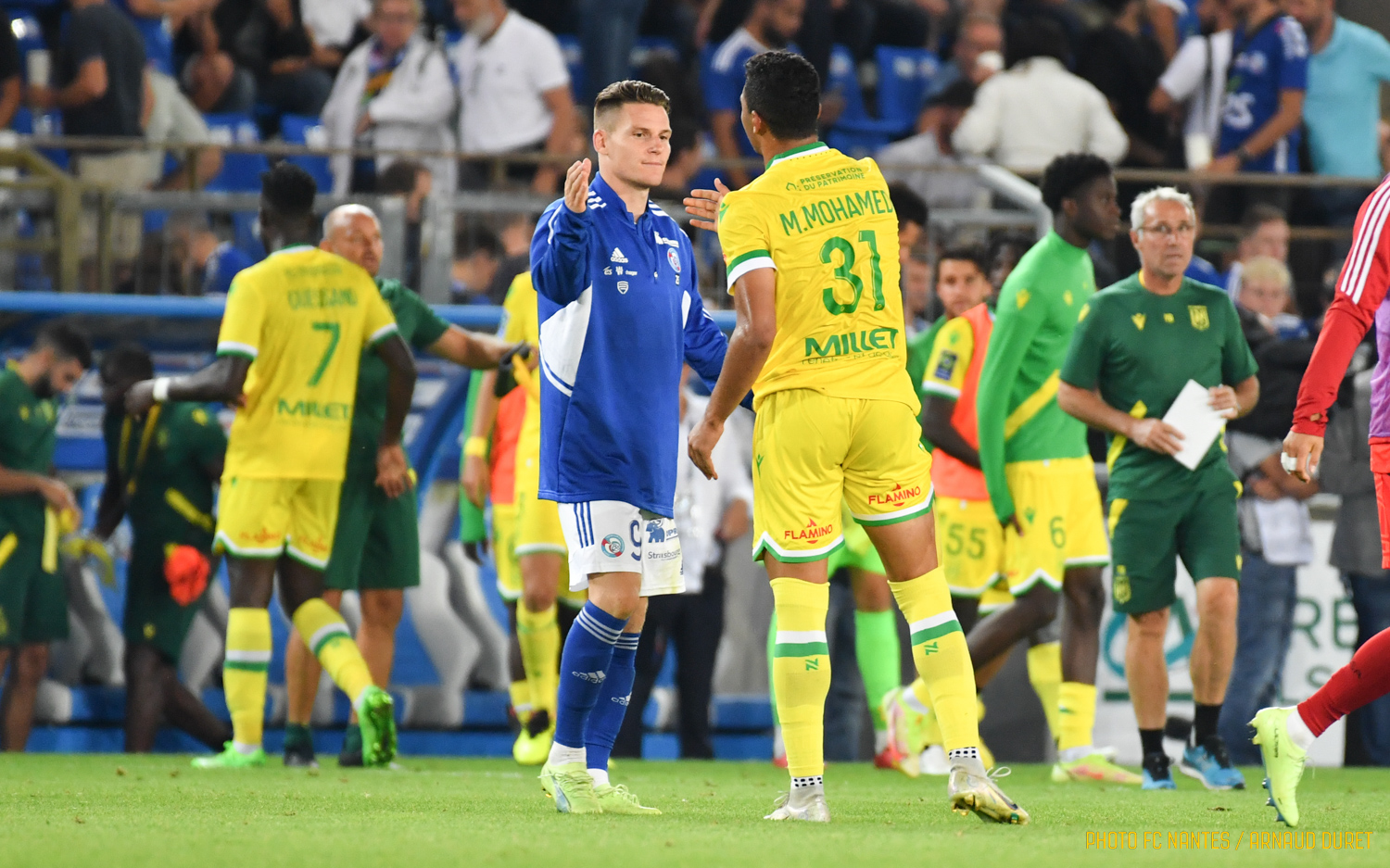 A l'image de Dennis Appiah et de Samuel Moutoussamy (photo en une), les Nantais pouvaient nourrir de la satisfaction au terme de la rencontre à la Meinau (1-1). Opposés au Racing Club de Strasbourg, les Nantais ont vu leurs efforts récompensés en toute fin de match grâce à une frappe ajustée signée Mostafa Mohamed (85e). L'international égyptien, auteur de son second but de la saison, répondait à l'ouverture du score d'Habib Diallo (28e). fcnantes.com vous propose de retracer les images de la rencontre durant laquelle les joueurs d'Antoine Kombouaré étaient soutenus par une centaine de supporters.