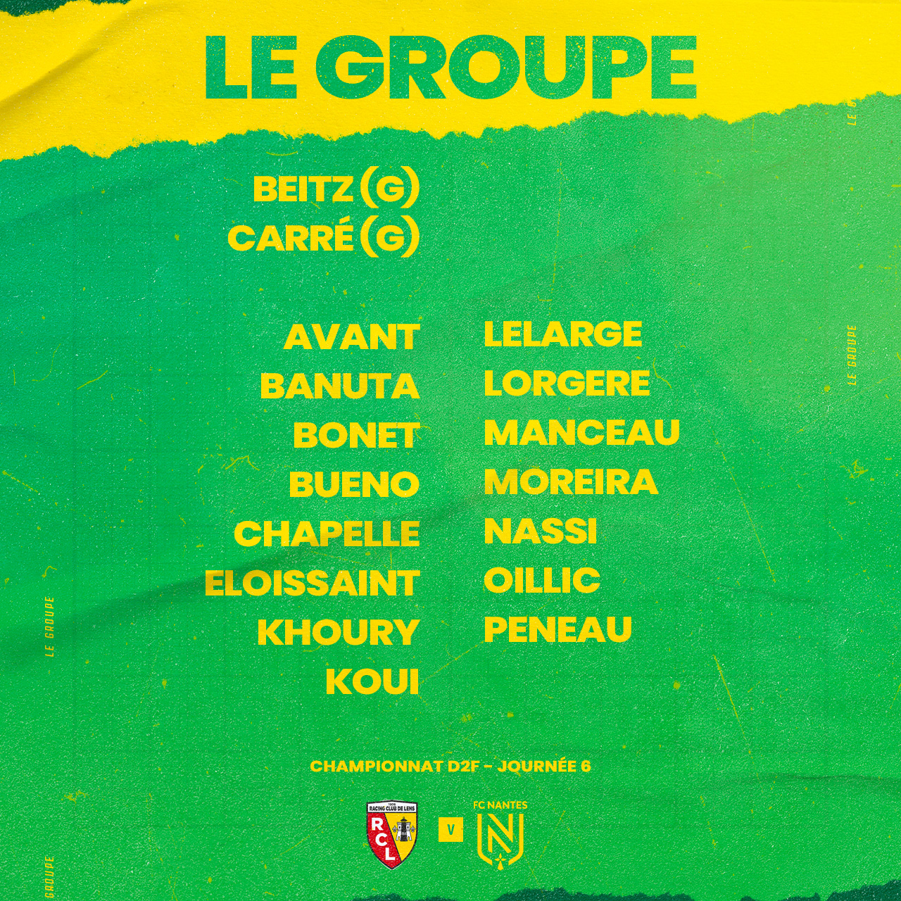 La formation D2F du FC Nantes dispute dimanche après-midi (15h) la 6ème journée de championnat avec un déplacement dans le Nord pour y défier le RC Lens. Découvrez le groupe retenu par le technicien nantais, Mathieu Ricoul.