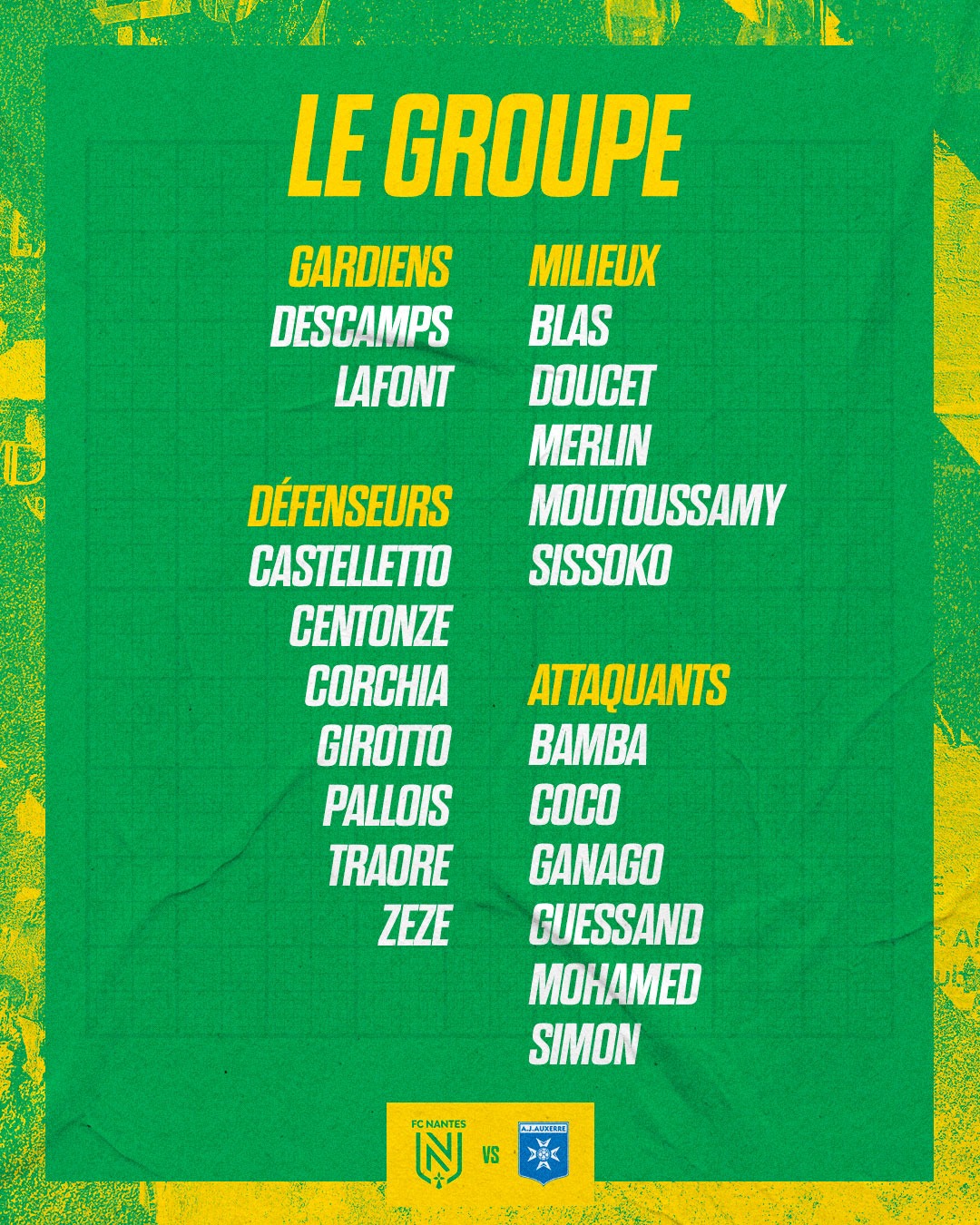 Antoine Kombouaré a retenu un groupe de 20 joueurs pour la réception de l'AJ Auxerre à La Beaujoire, dimanche après-midi (15h), pour le compte de la 17ème journée de Ligue 1 Uber Eats.