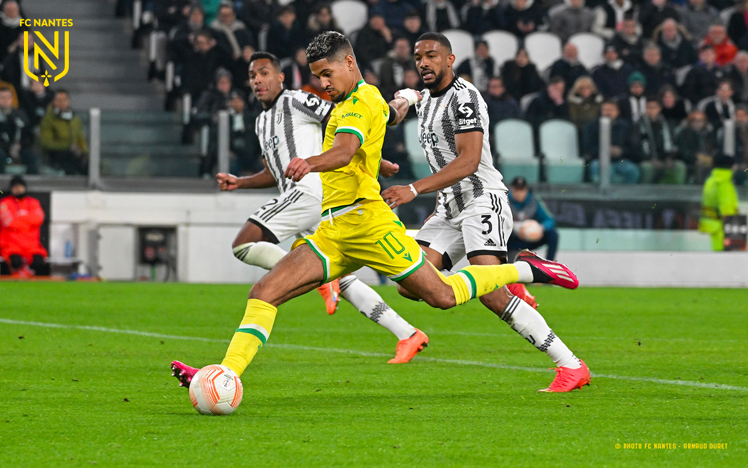 Touchés, les joueurs de la « Vieille Dame » s’enhardissent. Vlahovic trouve Chiesa. Ce dernier arme une puissante frappe du gauche qui vient heurte la barre puis rebondit sur la ligne avant de sortir (62’). La barre nantaise va trembler de nouveau sur un centre de Di Maria (66’). Si la Juventus n’est pas loin de reprendre les devants, le FC Nantes manque aussi pour quelques centimètres le but adverse, sur une frappe lointaine de Moutoussamy (71’). Les minutes passent et les Jaunes tiennent tête aux hommes d’Allegri. À l’image d’un Jean-Charles Castelletto héroïque sur un tacle défensif devant Rabiot qui filait au but (86’), les joueurs des rives de l’Erdre s’accrochent. Le danger guette toujours et Danilo manque de faire lever le Juventus Stadium une deuxième fois. Sa tentative, difficile à exécuter et dos au but, passe au-dessus (90+1’). Sur un dernier centre, Rugani, lui aussi au deuxième poteau, n’attrape pas le cadre pour quelques centimètres (90+5’). Sur l’action, le ballon est dévié par la main de Centonze. Mais M. Pinheiro, appelé par le VAR et après avoir visionné les images, n’accorde pas de penalty en faveur des Italiens, car il estime que le défenseur a été bousculé dans son dos (90+7').