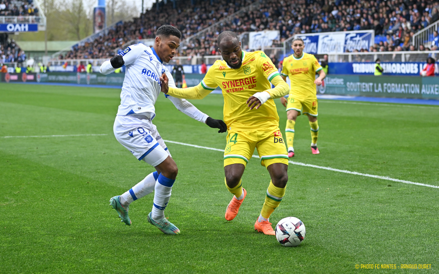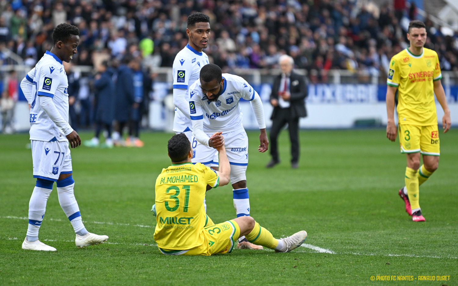 Le FC Nantes s'est incliné sur la pelouse de l'Abbé-Deschamps dans le cadre de la 31ème journée de L1 Uber Eats (2-1). Plombés par une entame de rencontre manquée et une première période durant laquelle l'AJA prenait ses distances (5e et 43e), les Jaunes-et-Verts ont rapidement compromis leur chance de ramener un résultat positif d'Auxerre. Intraitable sur sa ligne de but et sauvé par son montant sur une frappe de Ludovic Blas (photo en une), le portier icaunais Donovan Léon ne cédait que sur une tête à bout portant de Mostafa Mohamed (55e). Insuffisant pour les Nantais qui devront rapidement reprendre de la hauteur au général.