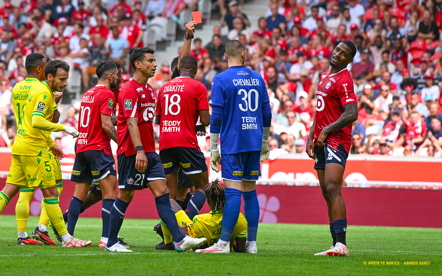 Lille pousse et Cabella monte en régime. Mais Descamps, d’une nouvelle intervention déterminante, repousse la frappe de l’ancien montpelliérain (69’). Avec les entrées en jeu d’Owusu Appuah, de Bamba ou encore de Marquinhos sur la ligne d’attaque, les Nantais densifient cette zone du terrain. Sur un ballon parfaitement glissé, Mohamed ne fait pas le bon choix devant Chevalier (73’). Bamba ensuite, manque de tranchant face au portier lillois (75’). Deux opportunités qui auraient pu permettre aux Canaris de revenir dans la partie… Les Jaunes sont plus entreprenants sur cette fin de match. Sur une récupération haute, Bamba s’échappe avant d’être repris illicitement par Alexsandro. M. Gaillouste sort le carton rouge pour le défenseur lillois (79’).