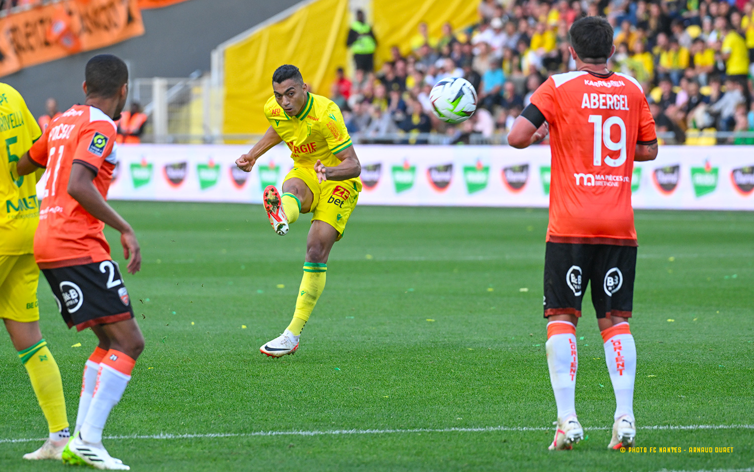 Les Nantais tentent de réagir mais les visiteurs du jour jouent tout en maîtrise et parviennent parfaitement à se défaire du pressing. Le jeu est équilibré, chaque équipe a son temps fort. Il faut attendre la 39ème minute de jeu pour connaître le premier frisson dans la défense lorientaise. Trouvé en retrait, Douglas Augusto arme du gauche mais Mvogo réalise la parade parfaite. Dans la foulée, les Canaris reviennent dans le match par l’intermédiaire de Mathis Abline, auteur de ses premières minutes en jaune et vert et donc, buteur (1-1, 42’).