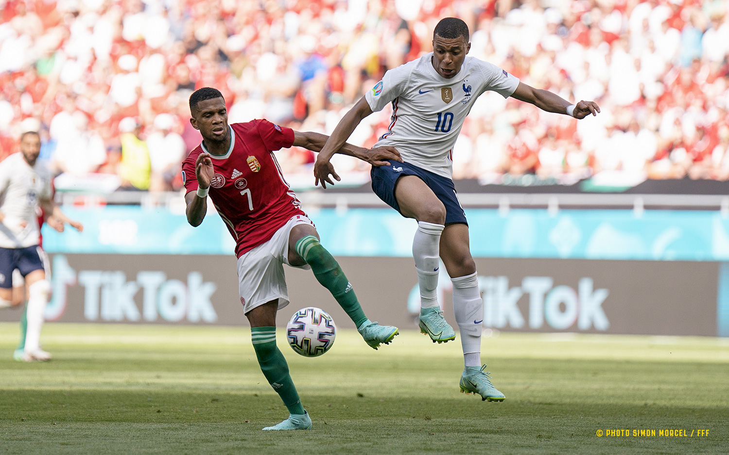 Loïc Nego, sous le maillot hongrois, ici à la lutte avec Kylian Mbappé lors de l'Euro 2021.