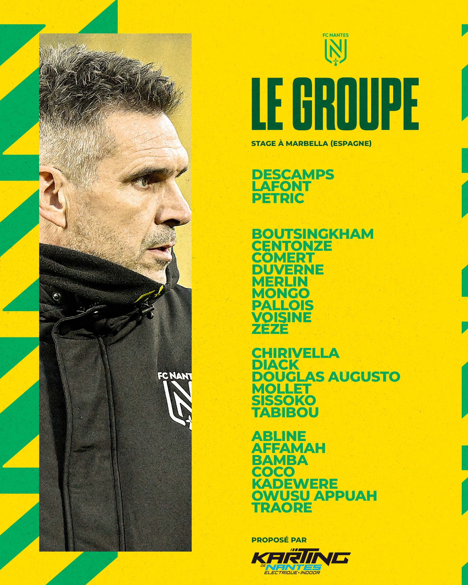 Jocelyn Gourvennec a retenu un groupe de 25 joueurs à l'occasion du stage à Marbella (Espagne), qui débute ce mardi 9 janvier et qui se terminera le vendredi 12 janvier. Pour rappel, les Jaune et Vert prépareront notamment la réception du Clermont Foot 63, dimanche après-midi (15h), au Stade de La Beaujoire. Cette rencontre comptera pour la 18ème journée de Ligue 1 Uber Eats.