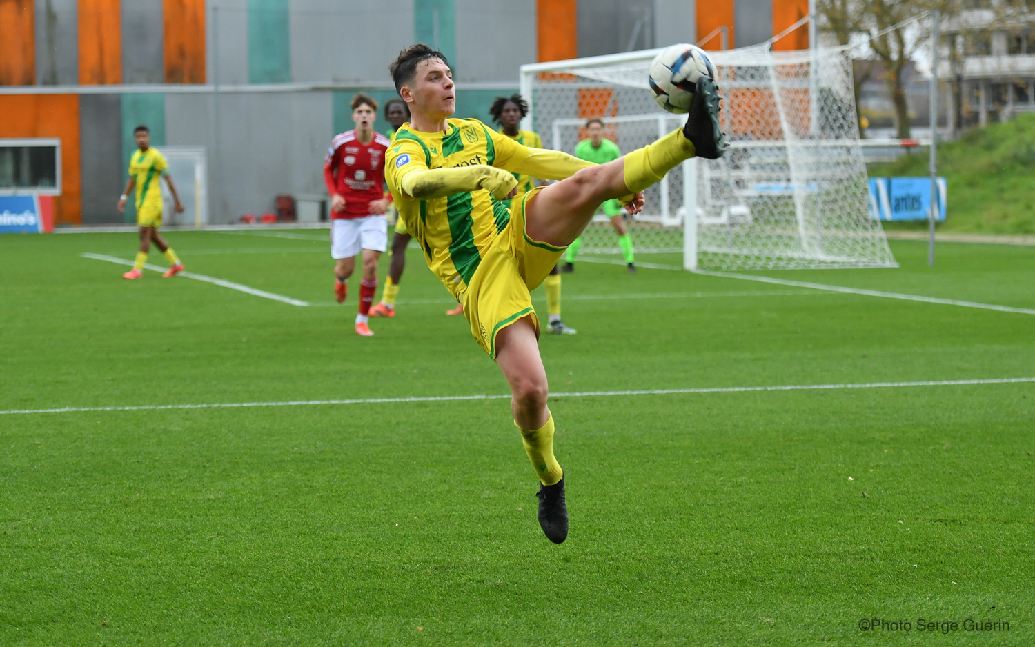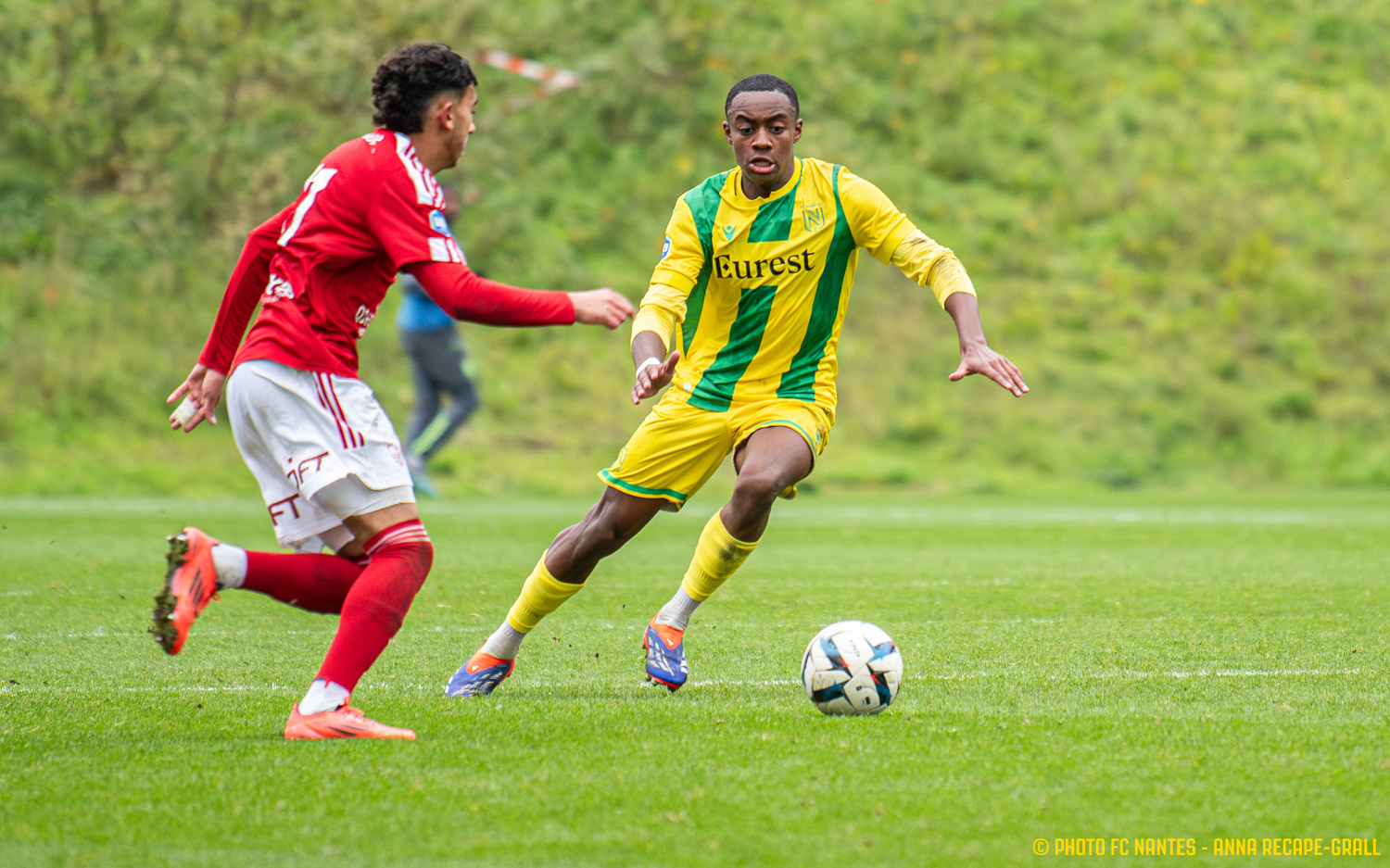 Dans le cadre du match au sommet du Championnat National U19, les Nantais ont arraché la victoire aux dépens du Stade Brestois 29 (1-0). Face à une solide opposition, les Jaunes-et-Verts ont résisté avant de porter une banderille décisive par l'intermédiaire de l'attaquant Moustapha Dabo (74e : 1-0). Une réalisation qui permet à la formation nantaise emmenée par Stéphane Moreau de compter 30 points (après seulement 12 journées) et d'occuper seul le fauteuil de leader. Retour en images sur la rencontre face au Stade Brestois 29.