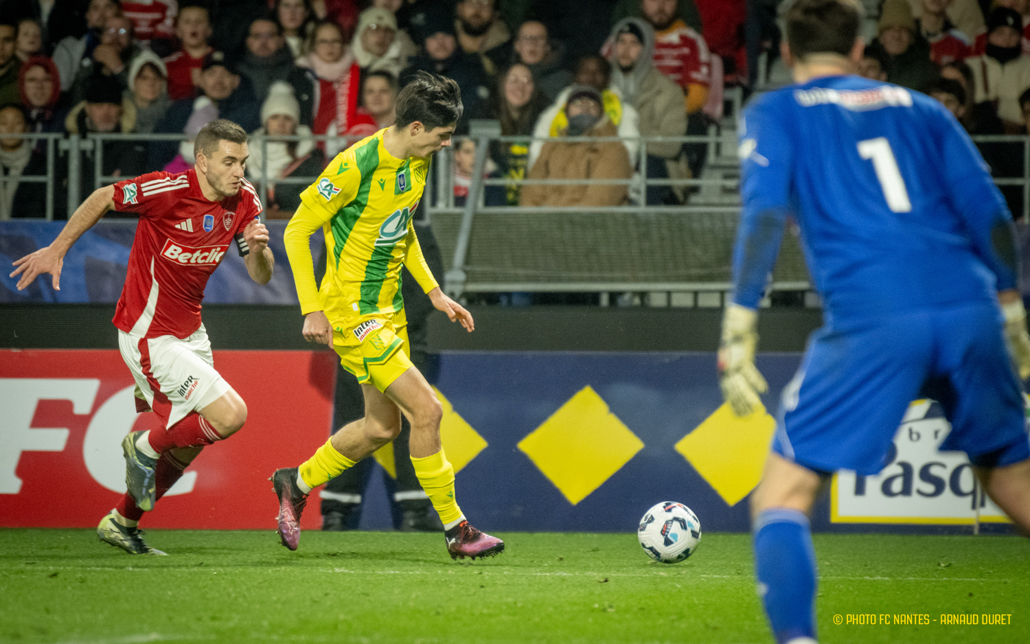 Le parcours du FC Nantes en Coupe de France s'est arrêté au stade des 16èmes de finale. En lice face au Stade Brestois 29 sur la pelouse de Francis Le Blé, les joueurs d'Antoine Kombouaré ont plié à deux reprises en première période (24e et 34e) avant de réduire l'écart grâce à Bahereba Guirassy (2-1, 84e). Une réaction malheureusement trop tardive pour les coéquipiers de Pedro Chirivella éliminés dès leur deuxième match de cette édition 2024-2025. Retour en images sur la rencontre durant laquelle les Jaunes-et-Verts étaient soutenus par plus de 350 fans.