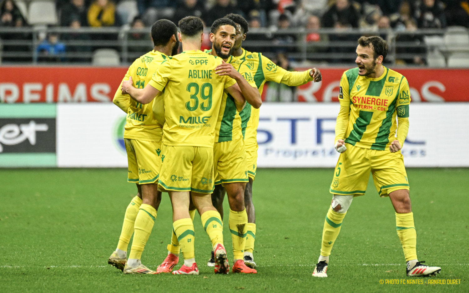 Le FC Nantes s'est imposé face au Stade de Reims dans le cadre de la 20ème journée de Ligue 1 McDonald's (1-2). Une victoire précieuse acquise grâce l'abnégation et la solidarité de tout un groupe soutenu par près de 500 supporters présents à Auguste-Delaune. Matthis Abline et Mostafa Mohamed ont récompensé la performance collective des Jaunes-et-Verts en trouvant le chemin des filets champenois (42e et 70e). Retour en images sur une soirée enfin pétillante !