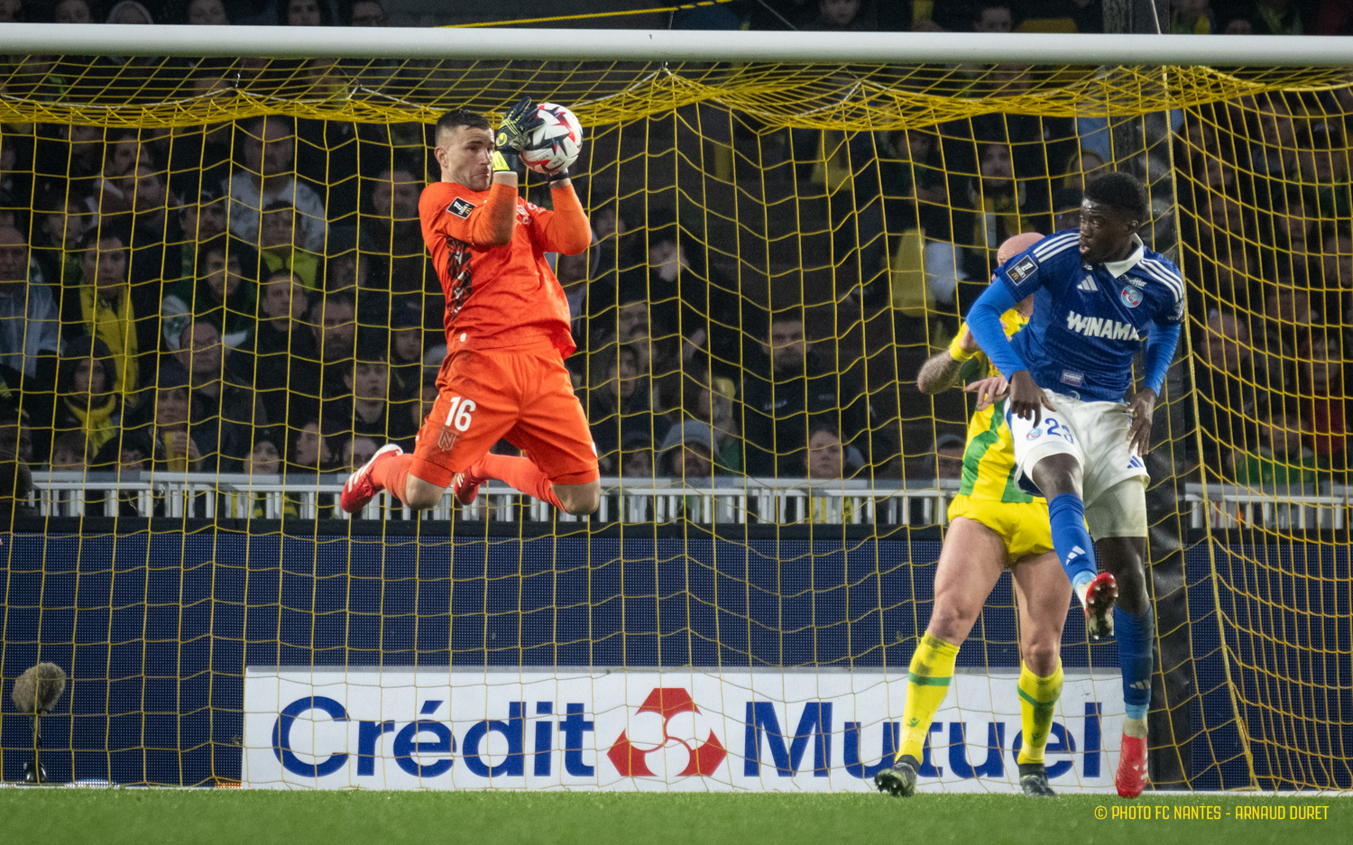 Bousculés par une vaillante formation strasbourgeoise, les coéquipiers de Jean-Charles Castelletto (photo en une) n'ont pas résisté à la Beaujoire malgré le soutien des 28000 supporters présents (0-1). Les Jaunes et Verts ont cédé en seconde période sur une réalisation de Félix Lemaréchal idéalement servi par Dilane Bakwa (79e). Retour en images sur la rencontre durant laquelle les acteurs endossaient un marquage unique "WO=MAN" dans le cadre de la Journée internationale des droits des femmes.