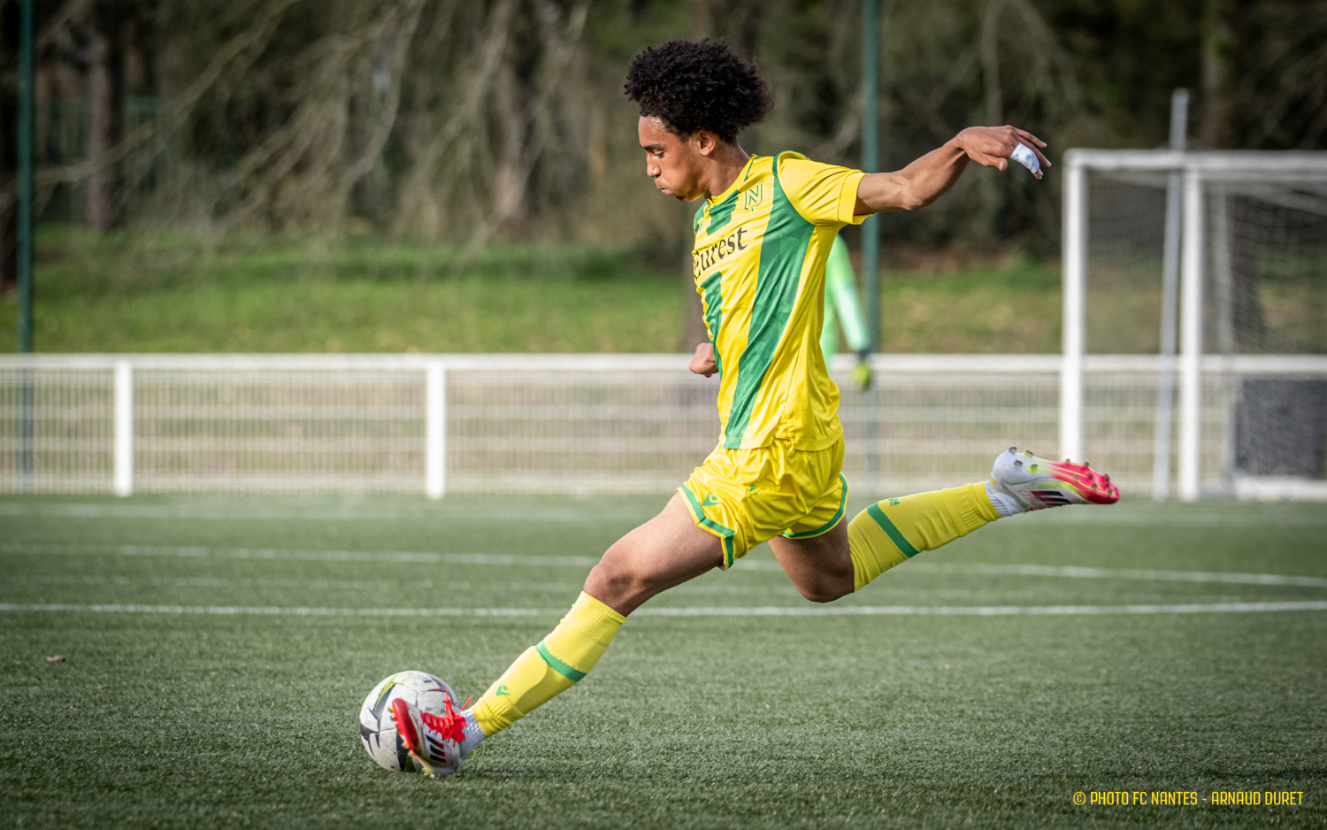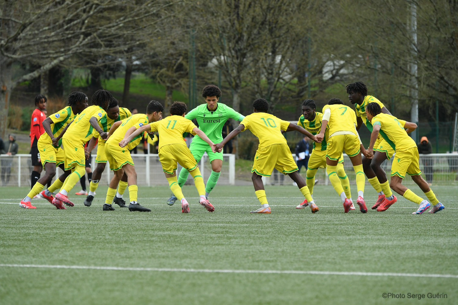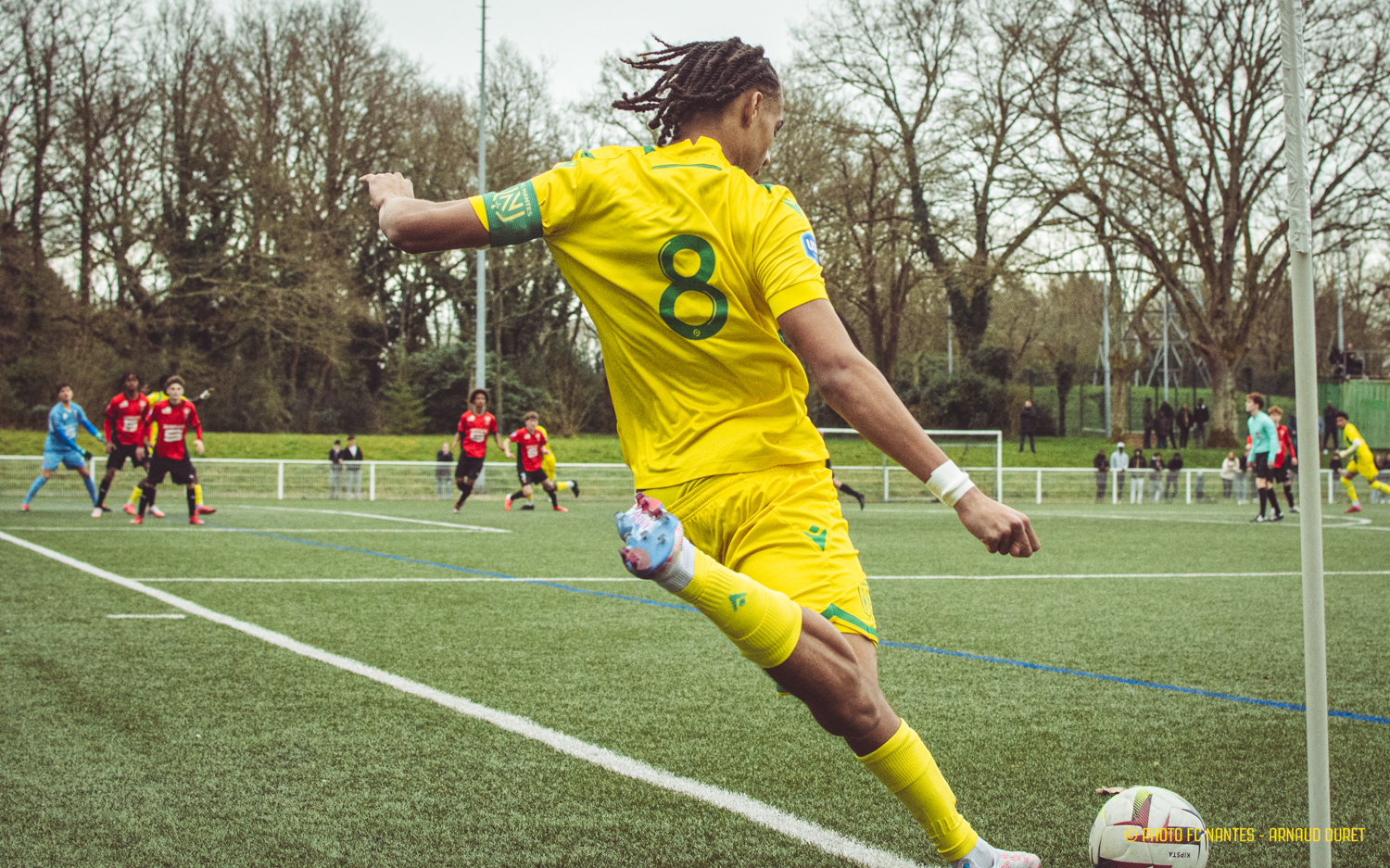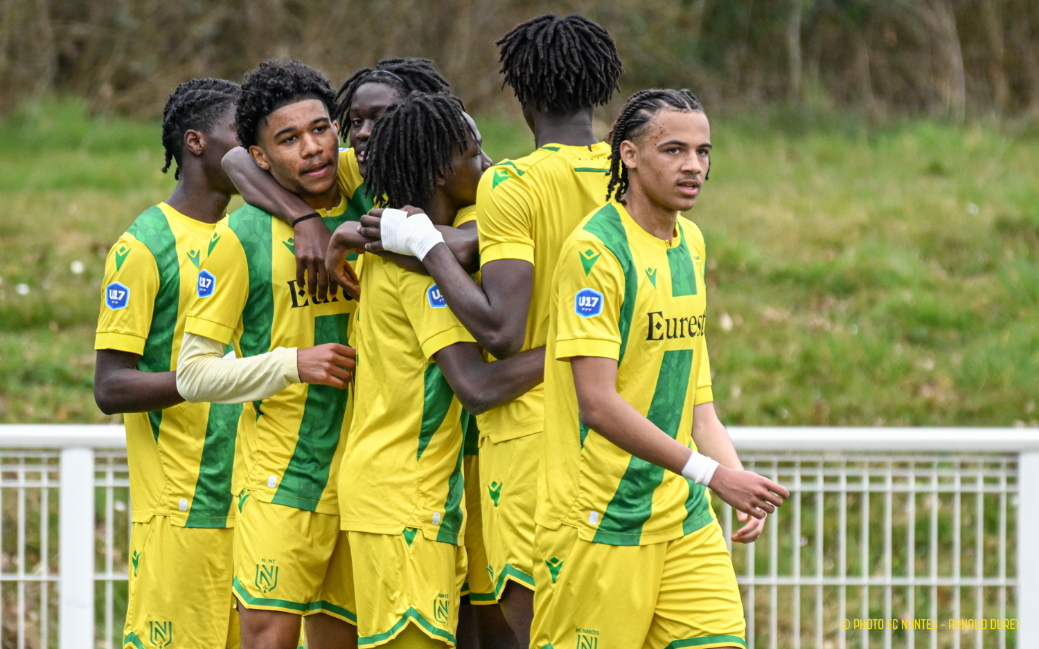 Les U17 Nationaux du FC Nantes ont remporté samedi dernier le derby face au Stade Rennais FC (3-1). Un succès, le douzième de la saison pour les joueurs de Maxime Baty, qui permet au groupe de rester au contact du leader brestois. A seulement une longueur des Finistériens à six journées du terme de la saison, les Nantais restent plus que jamais des prétendants aux playoffs. Flashback en images sur la performance des coéquipiers de Jalen Foucan à la Plaine de Jeux de la Jonelière.