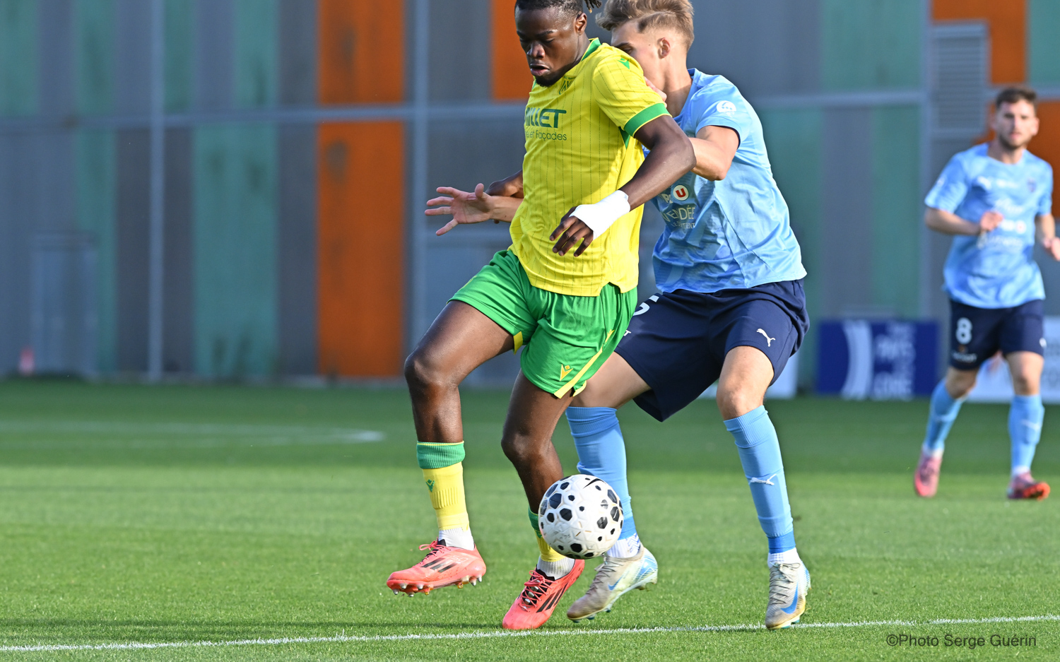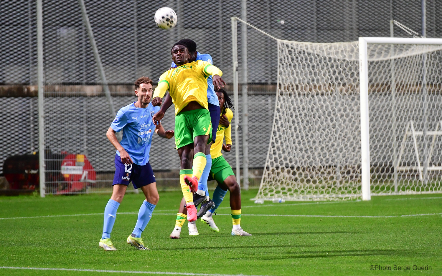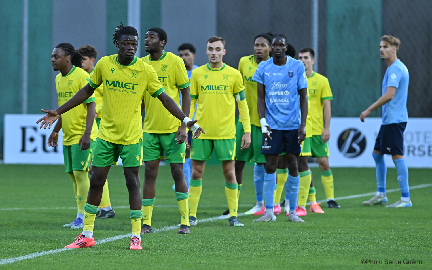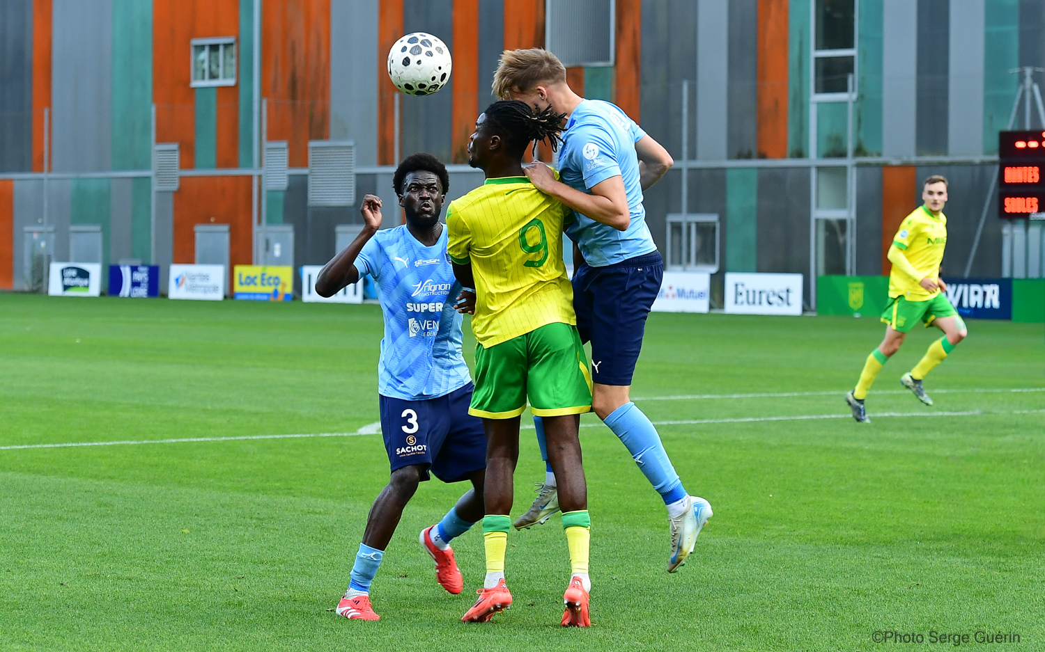 La formation de N3 du FC Nantes s'est accrochée à Marcel-Saupin pour obtenir le partage des points face aux Sables VF (2-2). Les joueurs de Stéphane Ziani avait pourtant pris les devants grâce à Sanah Camara, idéalement servi par Jordi Kuange (1-0, 15e). Les Vendéens ont réagi dans la foulée avant de prendre l'avantage à l'heure de jeu sur un doublé de l'attaquant sénégalais, Mansour Samb (20e et 64e). Les coéquipiers d'Enzo Mongo (photo en UNE) se sont accrochés jusque dans les derniers instants du match pour arracher in extremis le point du match nul sur une réalisation d'Emmanuel Kiah (90e : 2-2). Un match nul qui permet aux Jaunes et Verts de se maintenir dans la première partie du tableau à égalité de points avec l'Union Foot de Touraine (5ème).