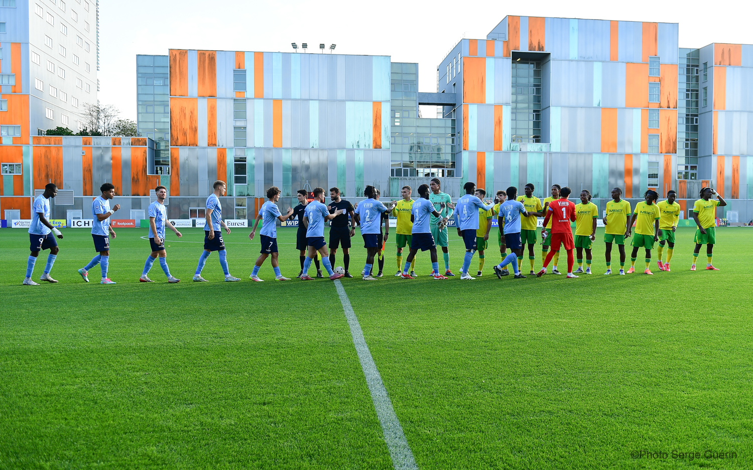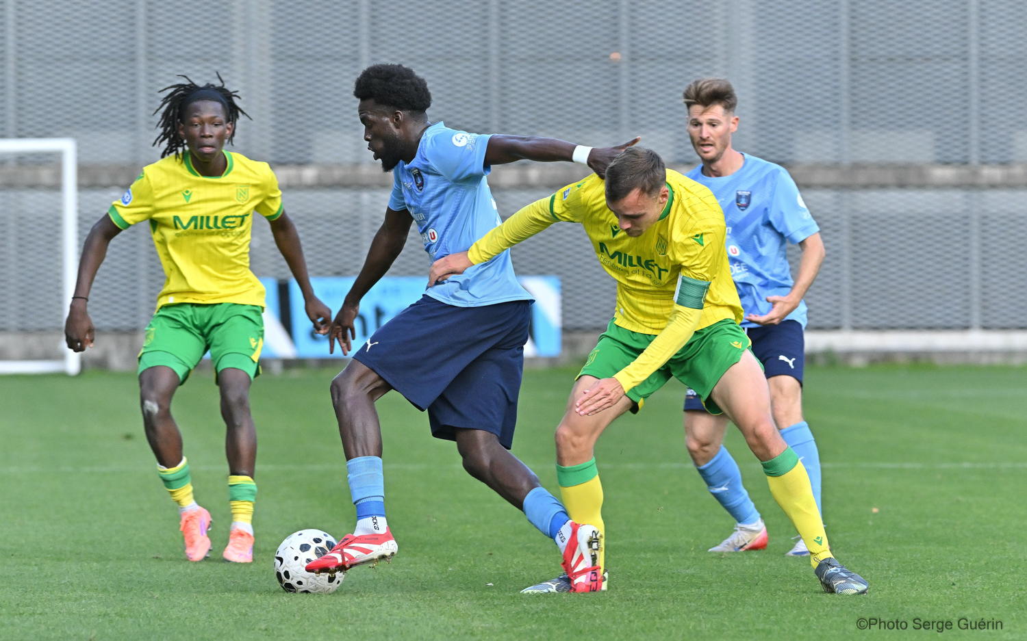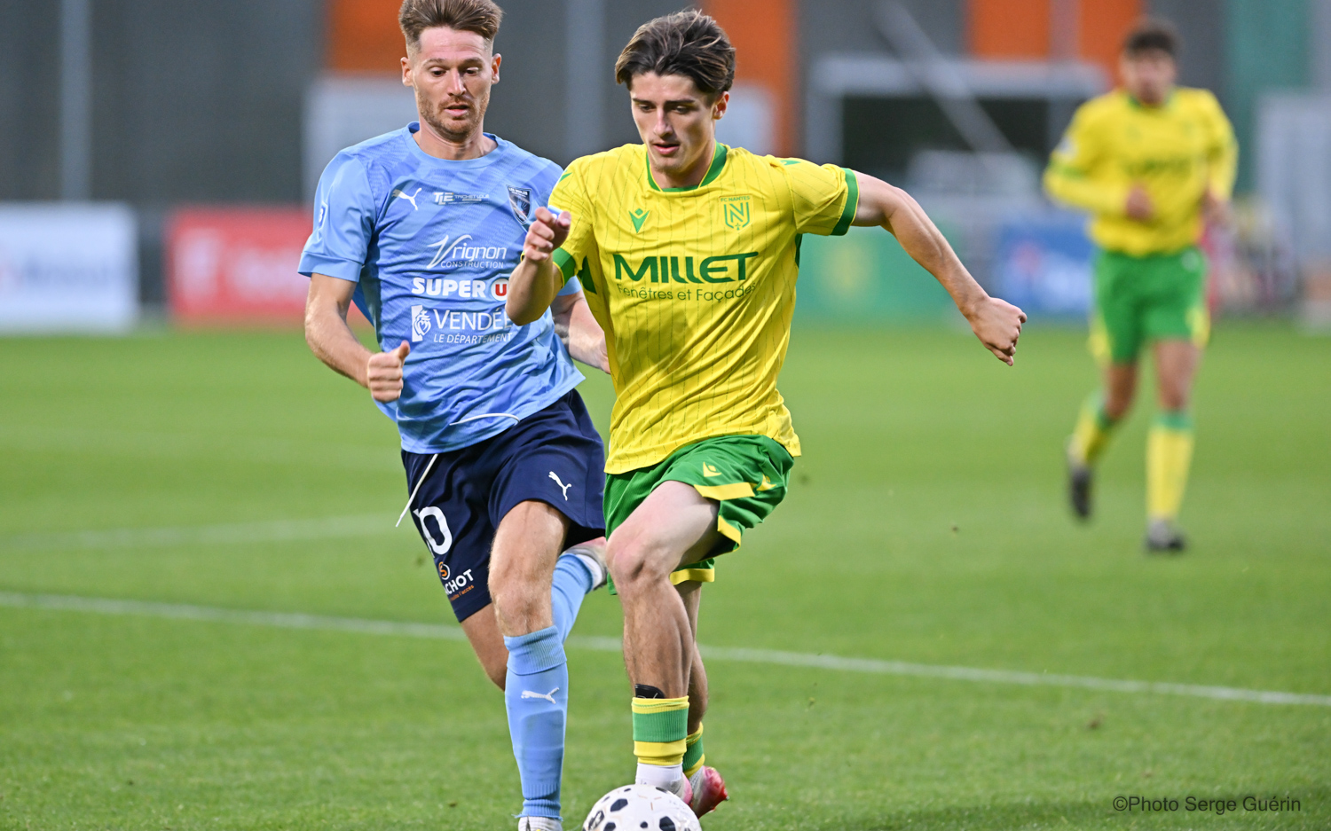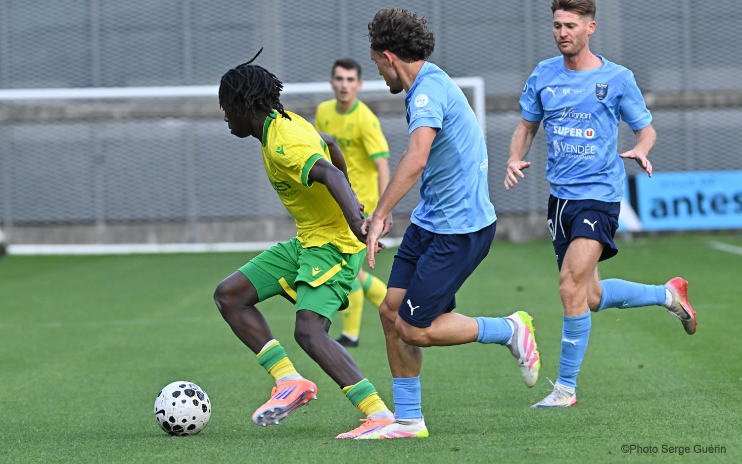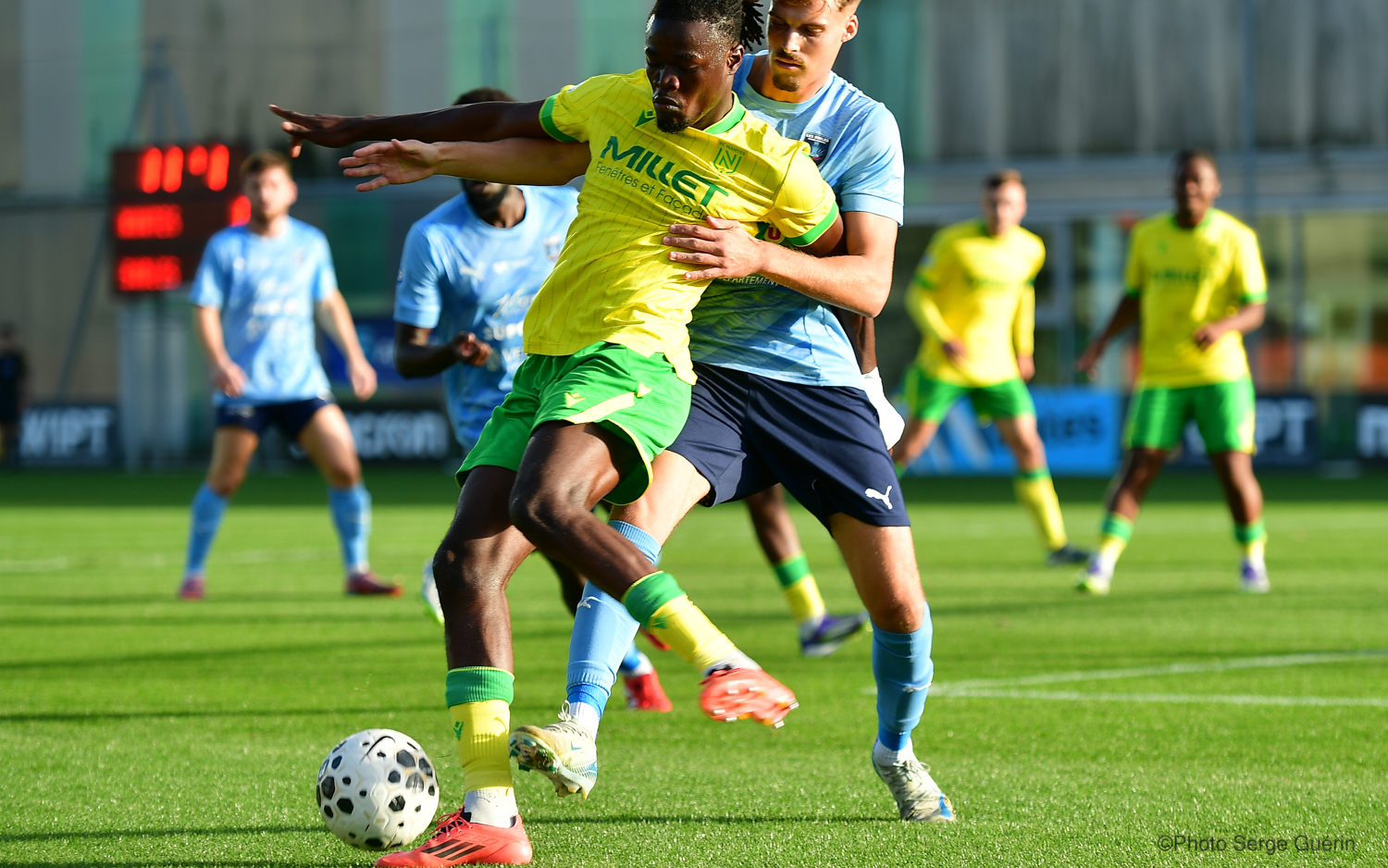 La formation de N3 du FC Nantes s'est accrochée à Marcel-Saupin pour obtenir le partage des points face aux Sables VF (2-2). Les joueurs de Stéphane Ziani avait pourtant pris les devants grâce à Sanah Camara, idéalement servi par Jordi Kuange (1-0, 15e). Les Vendéens ont réagi dans la foulée avant de prendre l'avantage à l'heure de jeu sur un doublé de l'attaquant sénégalais, Mansour Samb (20e et 64e). Les coéquipiers d'Enzo Mongo (photo en UNE) se sont accrochés jusque dans les derniers instants du match pour arracher in extremis le point du match nul sur une réalisation d'Emmanuel Kiah (90e : 2-2). Un match nul qui permet aux Jaunes et Verts de se maintenir dans la première partie du tableau à égalité de points avec l'Union Foot de Touraine (5ème).