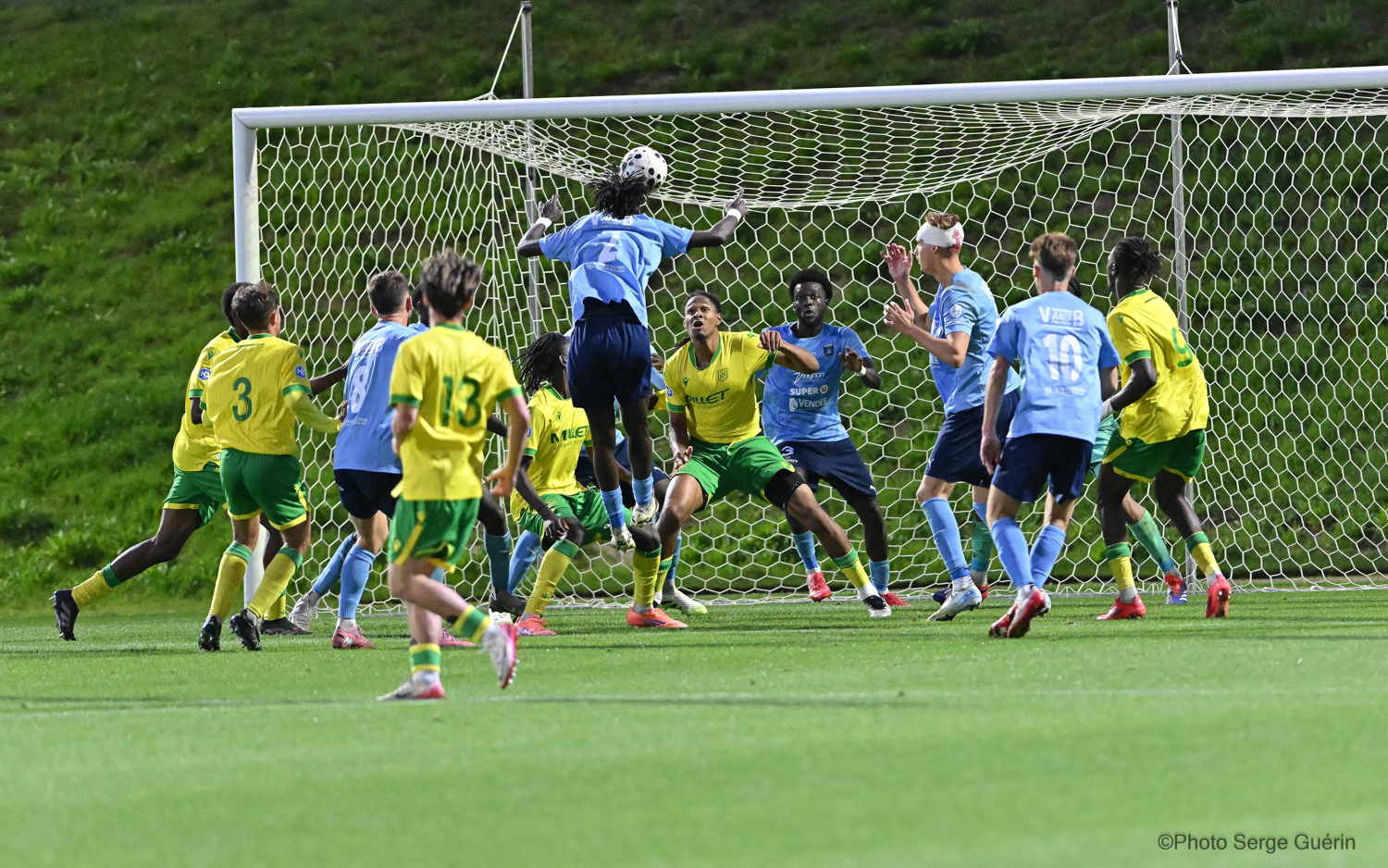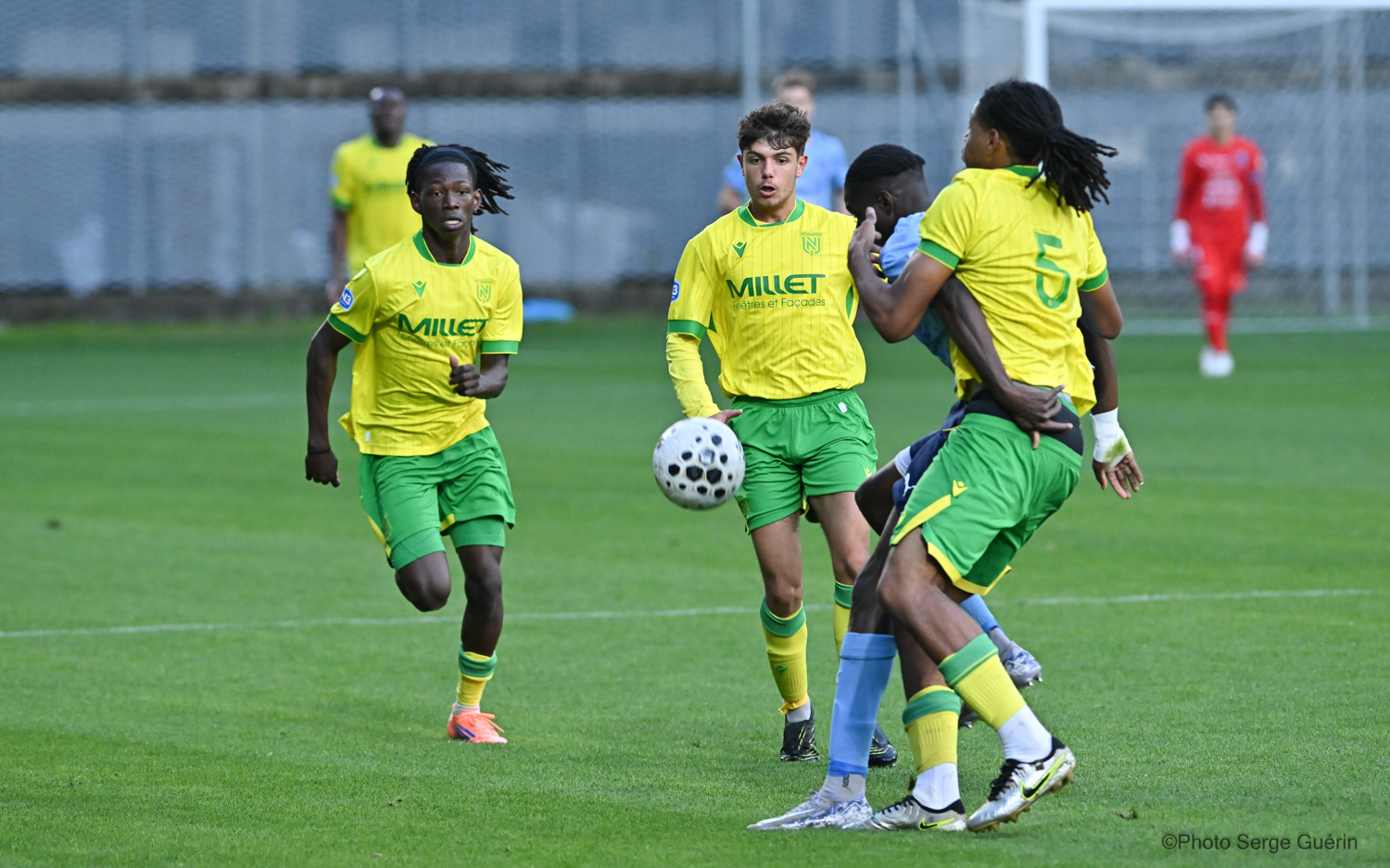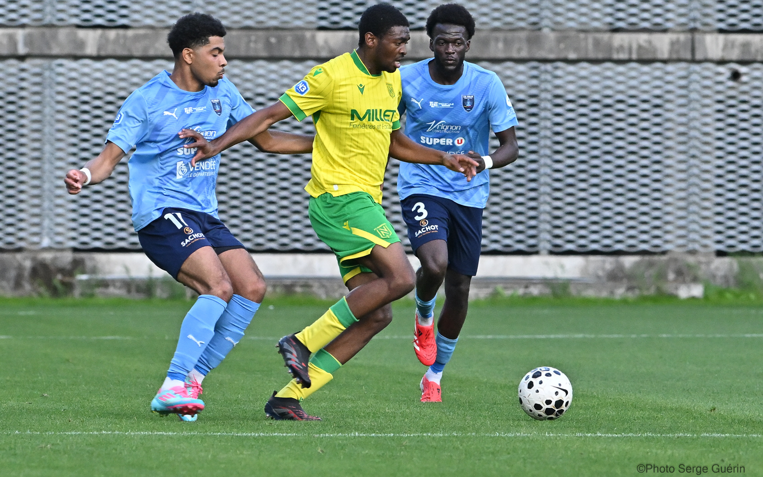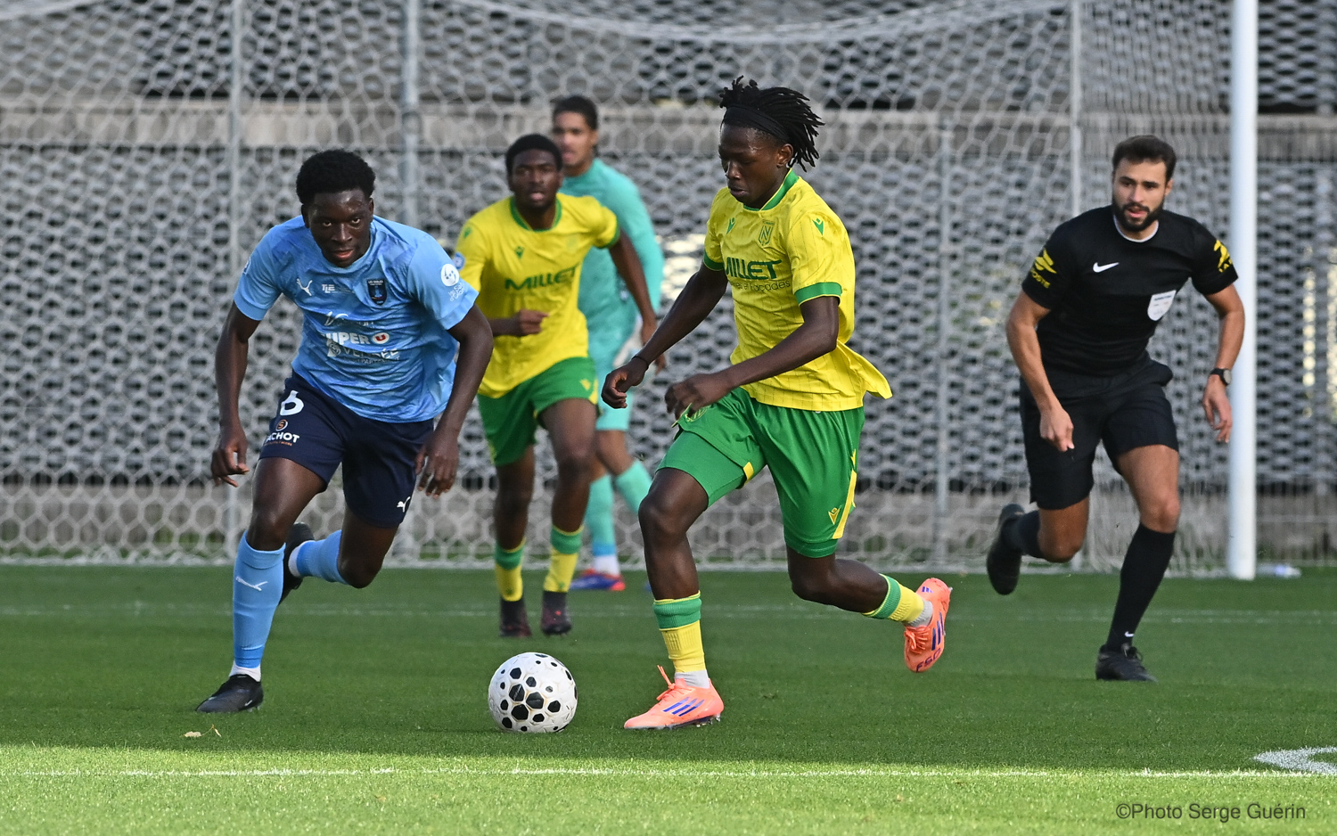 La formation de N3 du FC Nantes s'est accrochée à Marcel-Saupin pour obtenir le partage des points face aux Sables VF (2-2). Les joueurs de Stéphane Ziani avait pourtant pris les devants grâce à Sanah Camara, idéalement servi par Jordi Kuange (1-0, 15e). Les Vendéens ont réagi dans la foulée avant de prendre l'avantage à l'heure de jeu sur un doublé de l'attaquant sénégalais, Mansour Samb (20e et 64e). Les coéquipiers d'Enzo Mongo (photo en UNE) se sont accrochés jusque dans les derniers instants du match pour arracher in extremis le point du match nul sur une réalisation d'Emmanuel Kiah (90e : 2-2). Un match nul qui permet aux Jaunes et Verts de se maintenir dans la première partie du tableau à égalité de points avec l'Union Foot de Touraine (5ème).