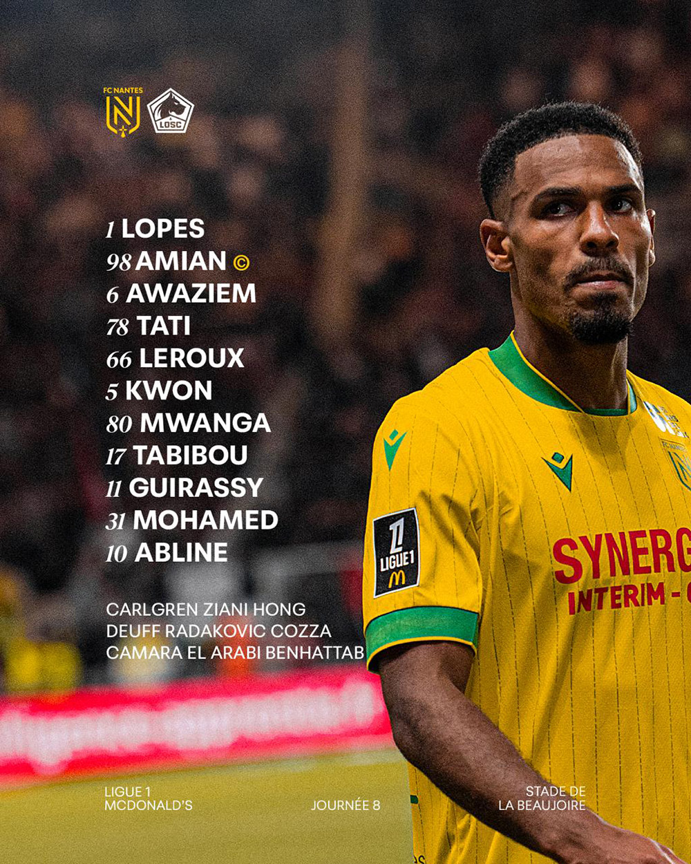 Retrouvez la composition retenue par Luis Castro pour débuter le match face au LOSC, en 8ème journée de Ligue 1 McDonald's. Coup d'envoi de la rencontre à 20h45.