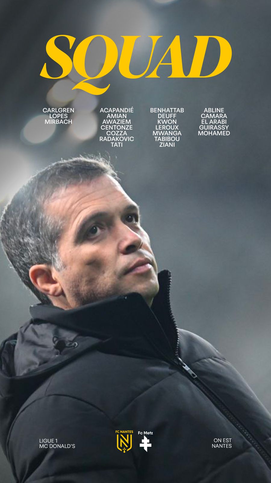 "On a le niveau. Les joueurs sont capables de mettre de plus en plus d'intensité. Quand tu es solidaire comme ça, ça te donne plus de force. Metz a besoin de points, je connais le coach ils vont venir ici pour gagner. Donc ça ne sera pas forcément un match fermé. Ils viennent de gagner contre une grosse équipe, ça va être une confrontation difficile." Luis Castro, entraîneur du FC Nantes lors de la conférence de presse d'avant-match.Le groupe nantais