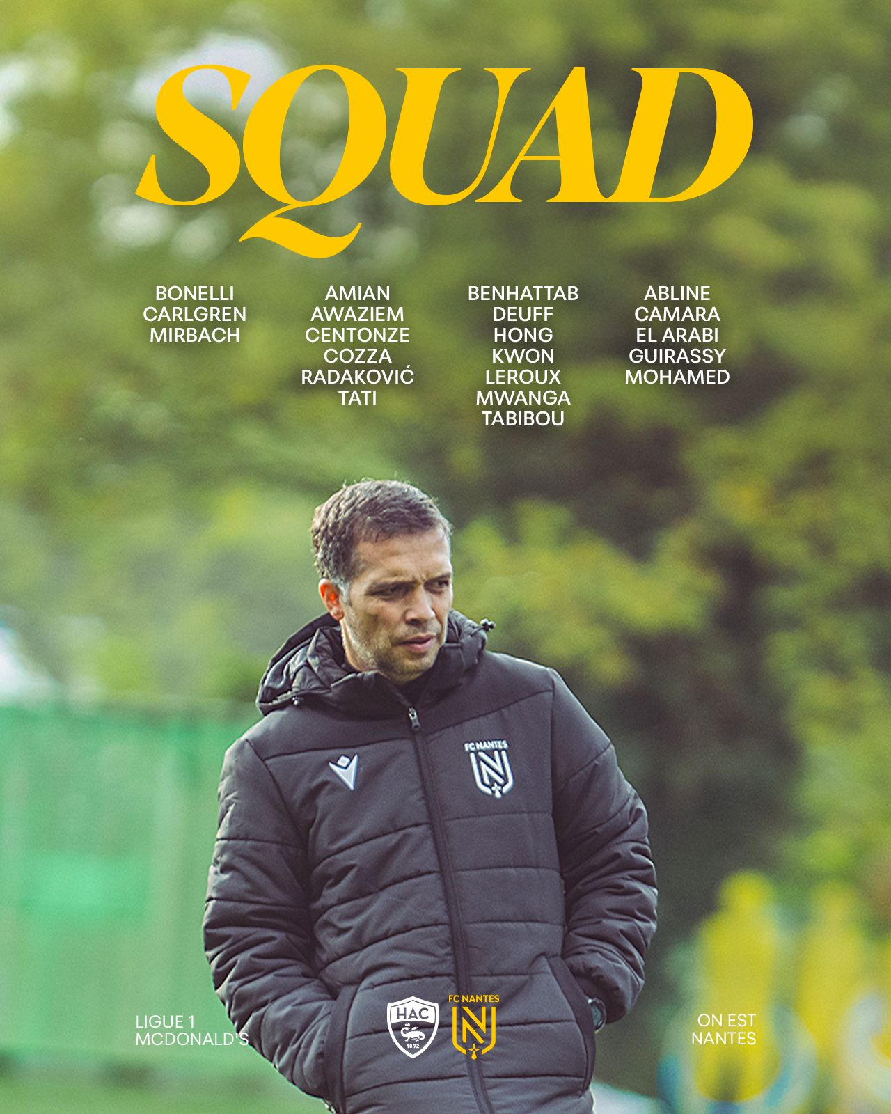 Pour son douzième match de la saison en Ligue 1 McDonald's, le FC Nantes se déplace sur les terres havraises, samedi 8 novembre à 19h, au Stade Océane. L'entraîneur Luis Castro a retenu un groupe de 21 joueurs pour cette rencontre.