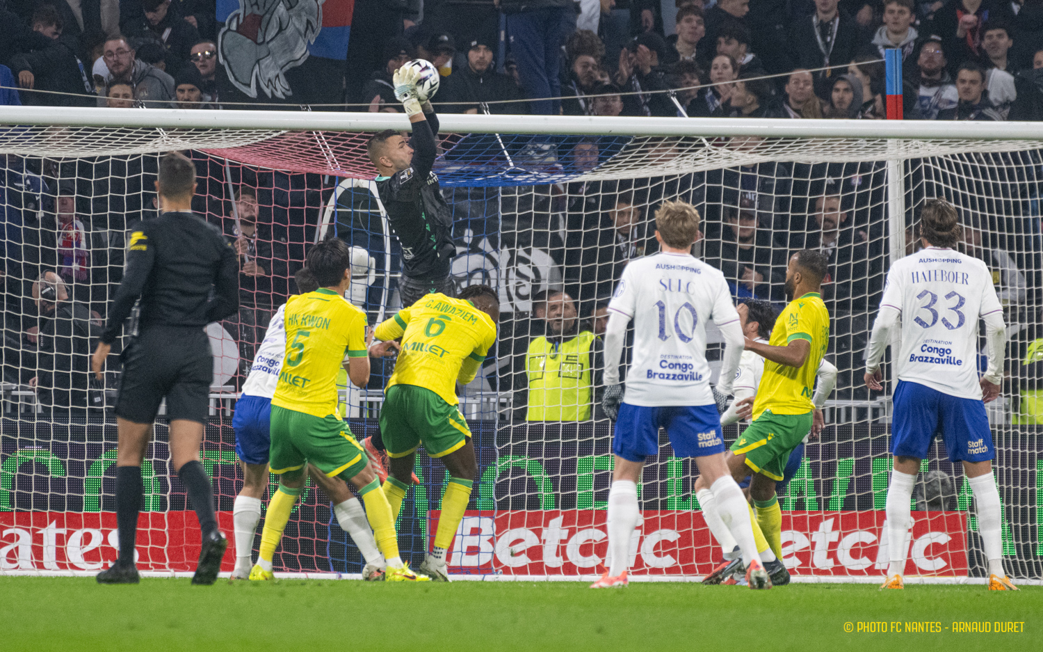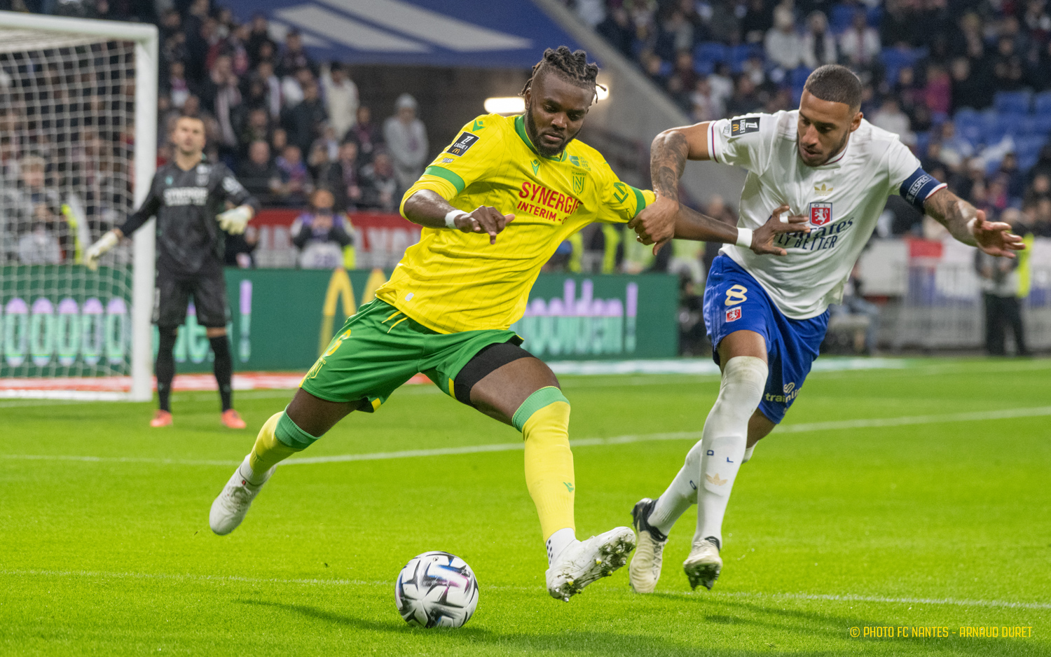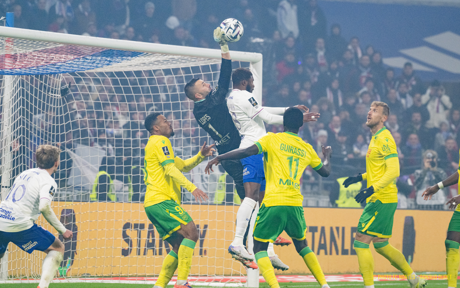 Les Canaris débutent bien : solides défensivement et dangereux offensivement, ils tiennent tête à un OL envieux. Appliqués, les Jaunes et Verts jouent leur partition. Le match est alors équilibré.