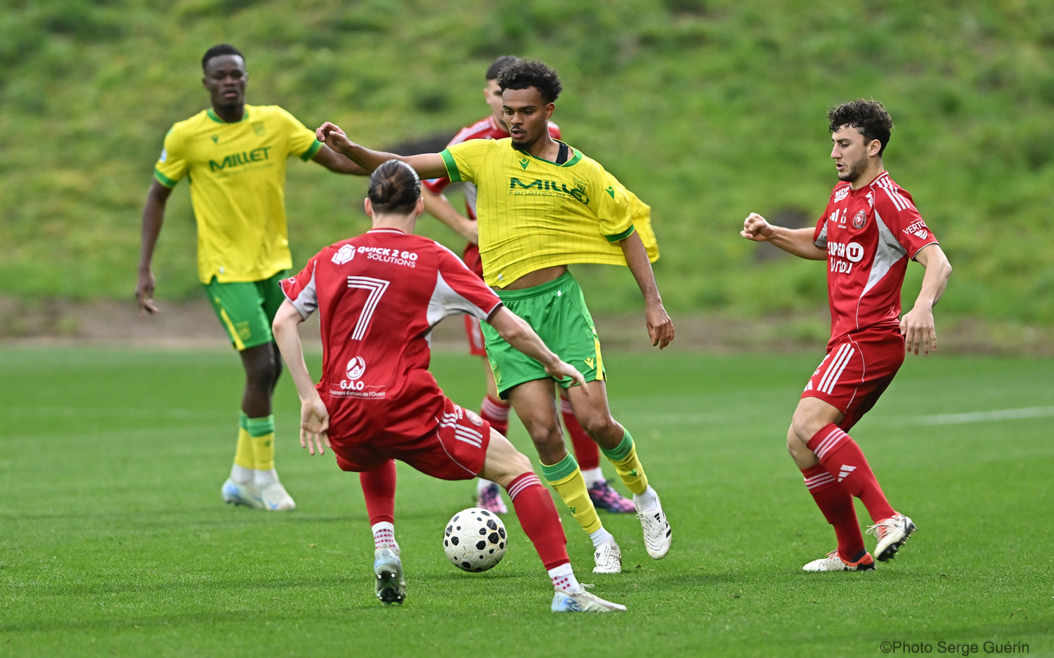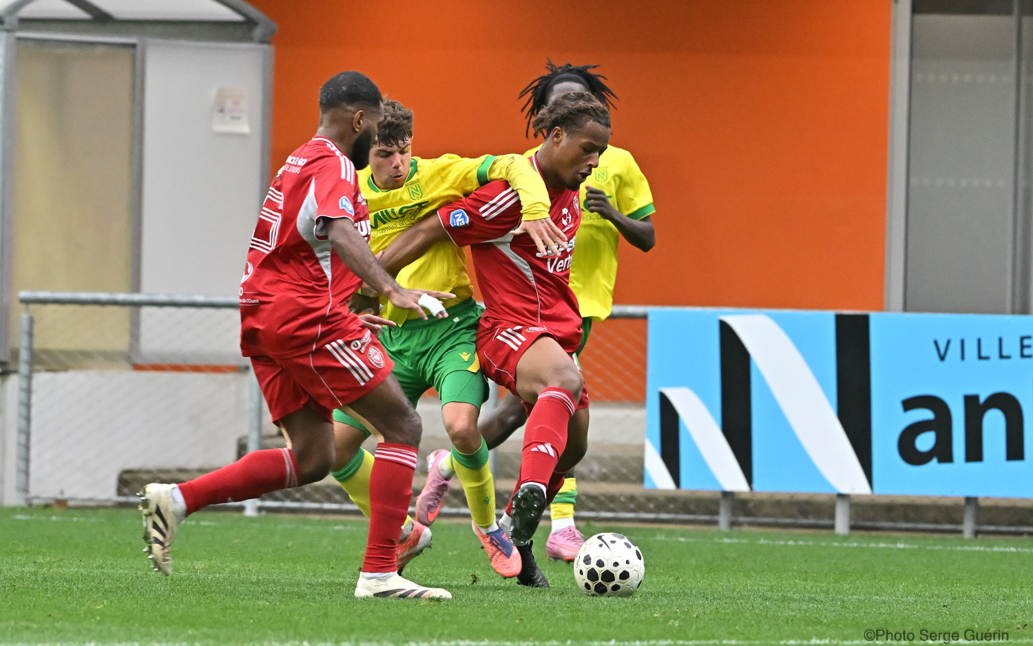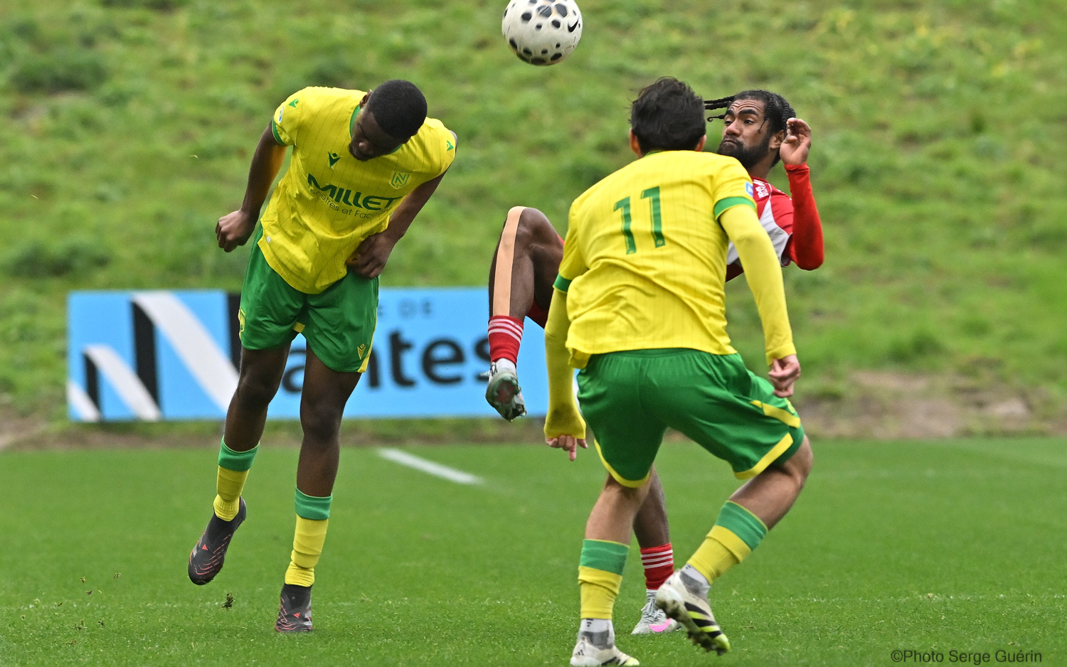 La formation de N3 du FC Nantes et l'US Saint-Anne de Vertou n'ont pas réussi à se départager dimanche après-midi à Marcel-Saupin (1-1). Les Jaunes-et-Verts ont concédé l'ouverture du score vertavienne dès la 19ème minute de jeu sur un penalty réussi par Lois Kisaku. Un avantage que les joueurs d'Yvonnick Sidaner ont longtemps tenu lors d'un derby disputé. Lancés par Stéphane Ziani à l'heure de jeu, Moustapha Dabo et Luka Gautier-Serant se montraient décisifs. L'attaquant, servi par l'ailier nantais, trouvait le chemin des filets pour arracher un point à une solide formation vertavienne (83e : 1-1).