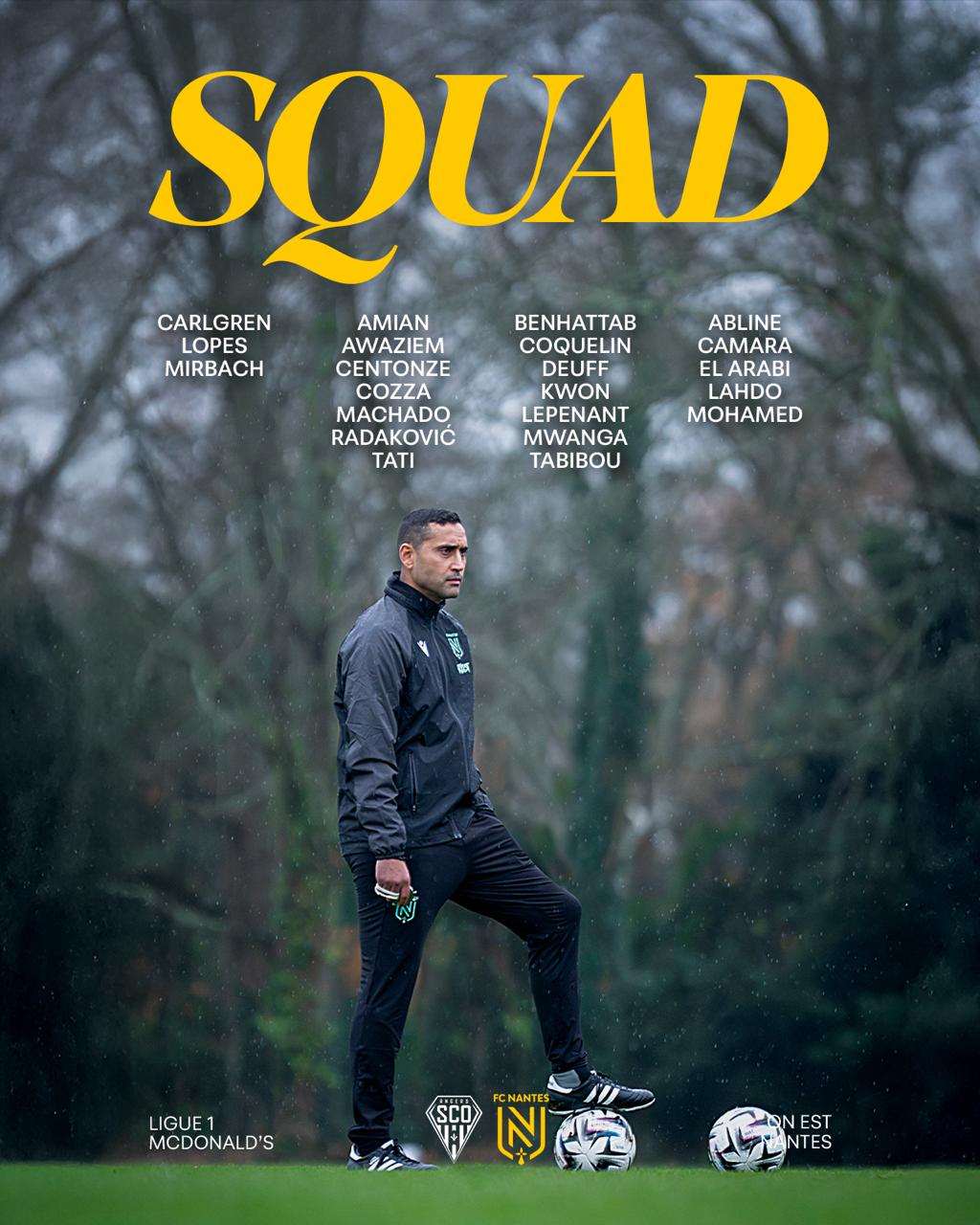 Pour sa première composition, le nouvel entraîneur du FC Nantes Ahmed Kantari a communiqué un groupe de vingt-deux joueurs pour le déplacement à Angers. Attendus au stade Raymond-Kopa dès vendredi soir (20h45), les Jaunes et Verts s'apprêtent à disputer face à Angers SCO le lever de rideau de la 16ème journée de Ligue 1 McDonald's.