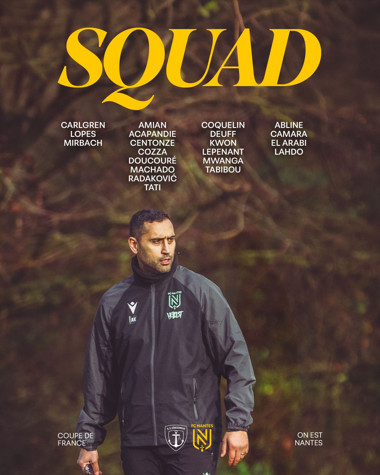 L'entraîneur du FC Nantes Ahmed Kantari a communiqué un groupe de vingt-et-un joueurs pour le déplacement à Concarneau. Attendus au stade Guy-Piriou dimanche après-midi (14h45), les Jaunes et Verts s'apprêtent faire leur entrée en lice en Coupe de France dans le cadre des 32èmes de finale.