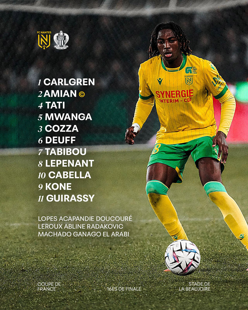 Retrouvez la composition retenue par Ahmed Kantari pour débuter ce match à la Beaujoire contre l'OGC Nice pour les 16e de finale de Coupe de France Crédit Agricole. Coup d'envoi de la rencontre à 18h.