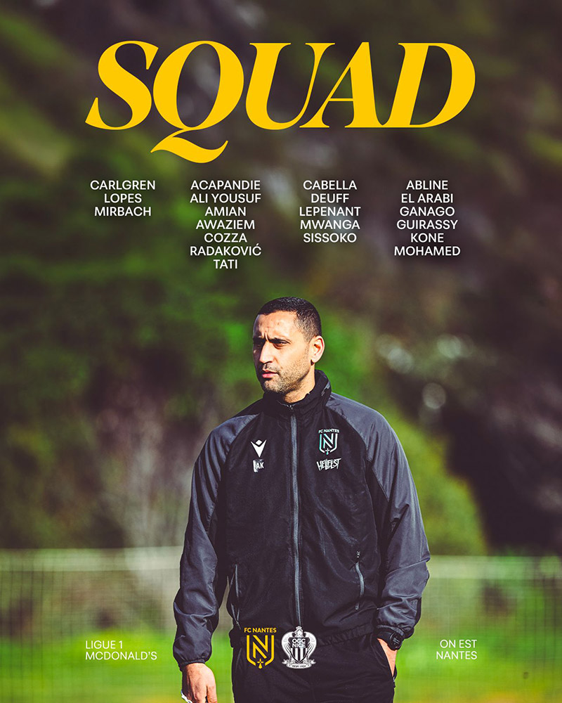 Ahmed Kantari a communiqué un groupe de 21 joueurs pour la réception de l'OGC Nice au Stade de la Beaujoire dimanche (15h). Les Jaunes et Verts s'apprêtent à disputer face aux Aiglons la 19e journée de championnat de Ligue 1 Mc Donalds.