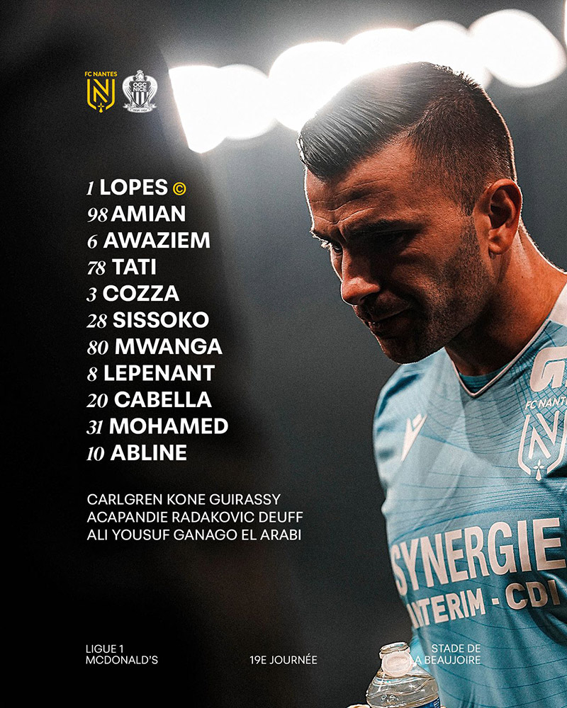 Retrouvez la composition retenue par Ahmed Kantari pour débuter ce match à la Beaujoire contre l'OGC Nice pour le compte de la 19e journée de Ligue 1 McDonald's. Coup d'envoi de la rencontre à 15h.