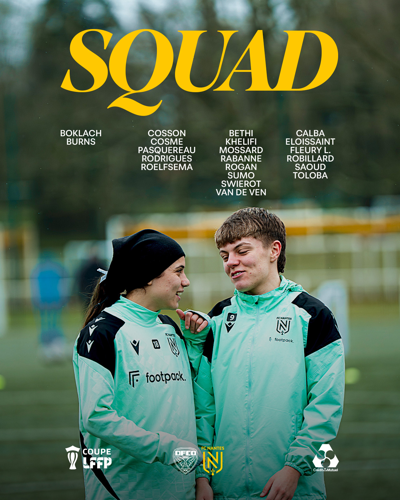 Voilà les 21 joueuses convoquées par le staff technique pour la double confrontation face au DFCO. Les nantaises ont quitté la Jonelière mardi après-midi et ne rentreront à Nantes que dans la nuit de samedi à dimanche.