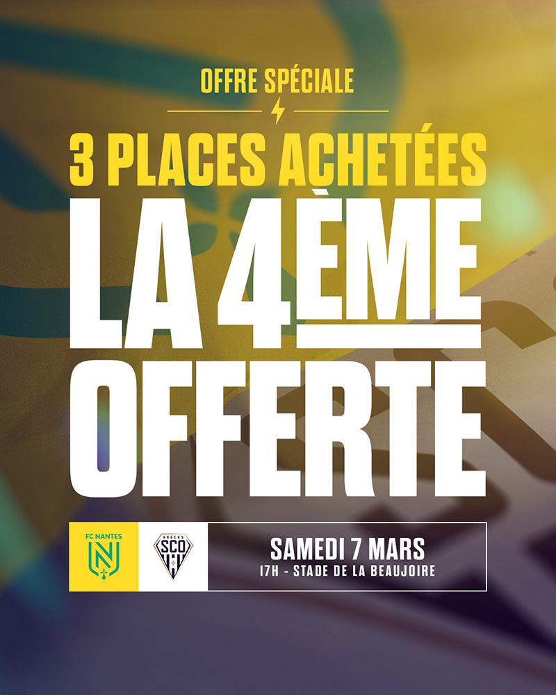 En 25e journée de Ligue 1 McDonald's, le FC Nantes accueillera le SCO d'Angers, le samedi 7 mars à 17h, au stade de la Beaujoire. La billetterie est ouverte. Offre spéciale (valable uniquement en ligne) : pour 3 places achetées, la 4e est offerte ! L'occasion de venir supporter les Jaunes et verts entre amis ou en famille !