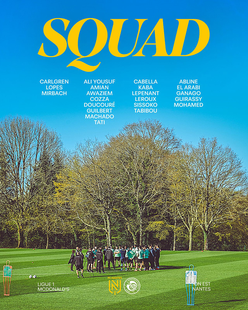 Le coach Vahid Halilhodzic a communiqué un groupe de 22 joueurs pour cette confrontation contre Strasbourg dimanche 22 mars (20h45). Les Jaunes et Verts s'apprêtent à disputer face aux Normands l'affiche de la 27ème journée du Championnat de Ligue 1 McDonald's.