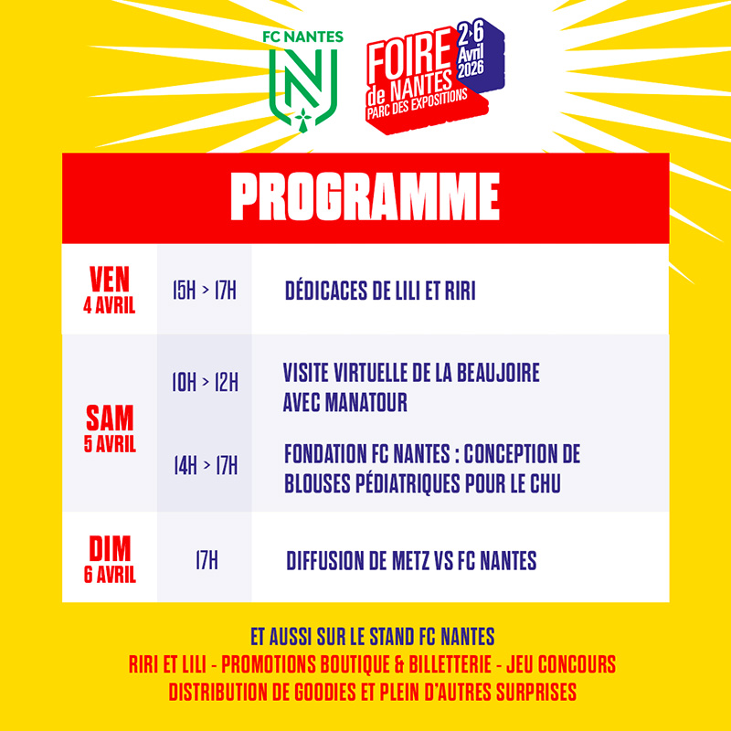 Le FC Nantes sera au rendez-vous de la Foire de Nantes 2026, qui se tiendra du 2 au 6 avril, de 10h à 19h (sauf le lundi, fermeture à 18h). Une belle occasion pour tous les supporters de vivre une expérience jaune et verte au cœur du Grand Palais ! Bonne nouvelle : l’entrée à la Foire est gratuite pour tous les abonnés du FC Nantes, sur simple présentation de leur carte d’abonnement.