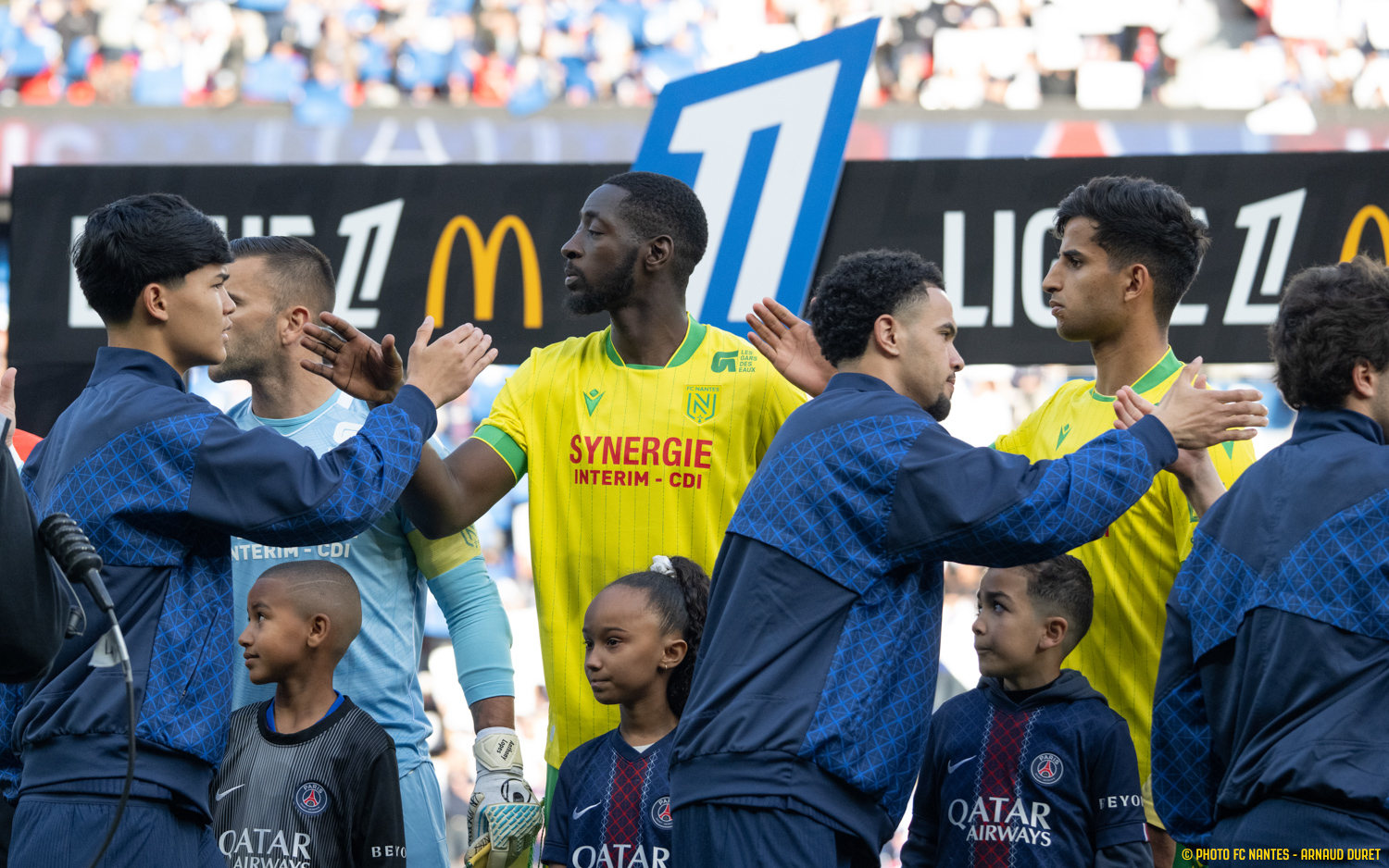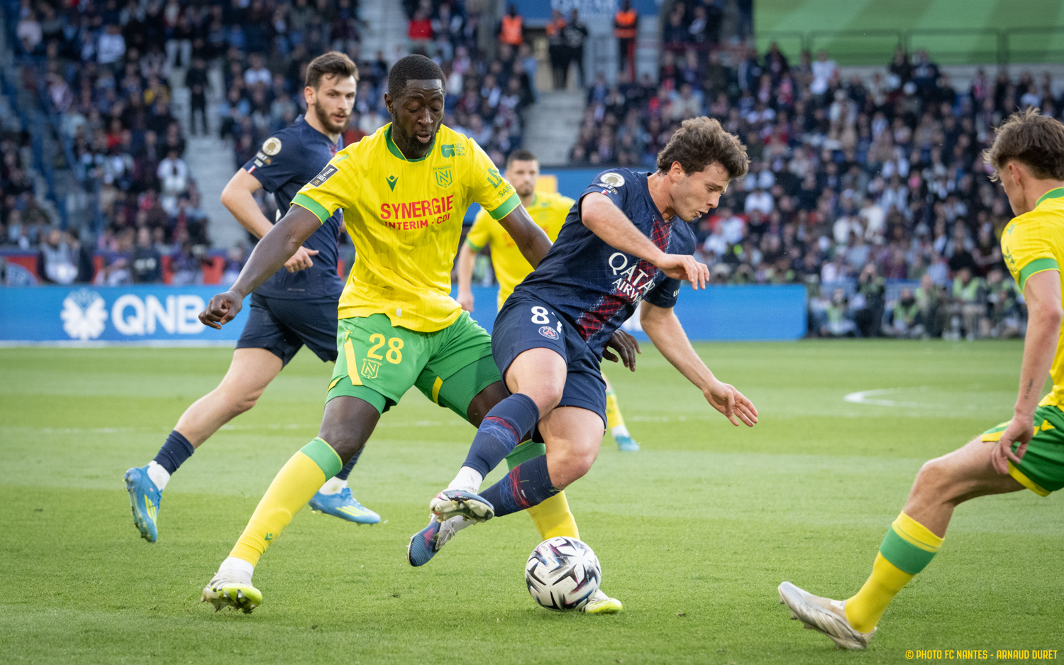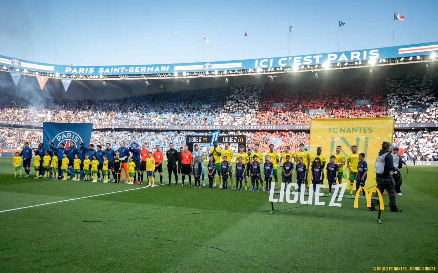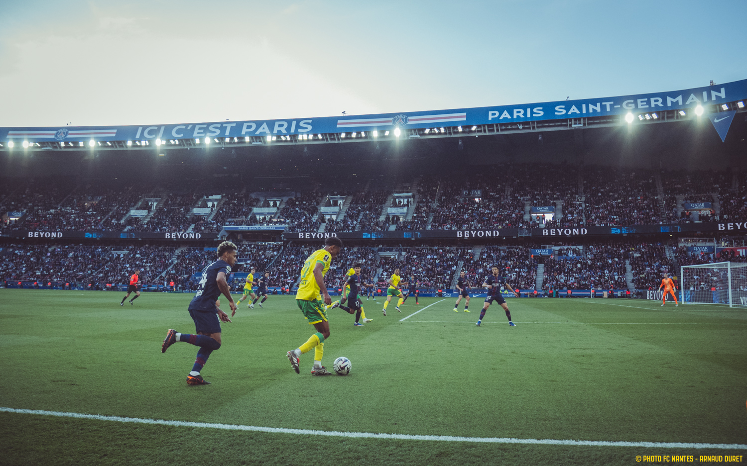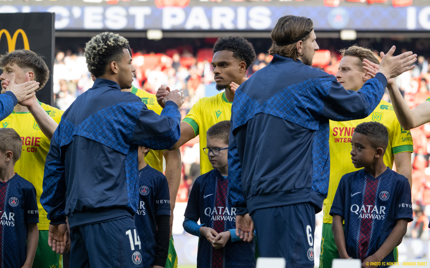 Le FC Nantes s'est incliné face au Paris SG en match reporté de la 26ème journée de L1 McDonald's (3-0). Khvicha Kvaratskhelia a ouvert la marque sur penalty dès la 13ème minute de jeu. Désiré Doué, auteur d'une frappe limpide en pleine lucarne (37e : 2-0), a doublé la mise pour le PSG qui scellait une solide prestation par le doublé de son international géorgien (50e : 3-0). Flashback en images sur la 96ème édition entre le Paris SG et le FC Nantes jouée devant près de 400 supporters des Jaunes et Verts présents au Parc des Princes.