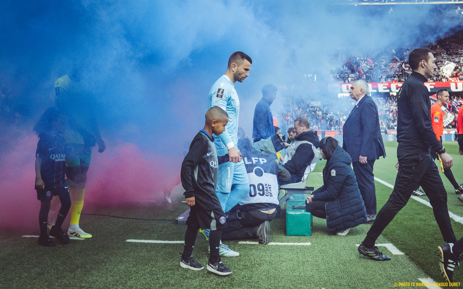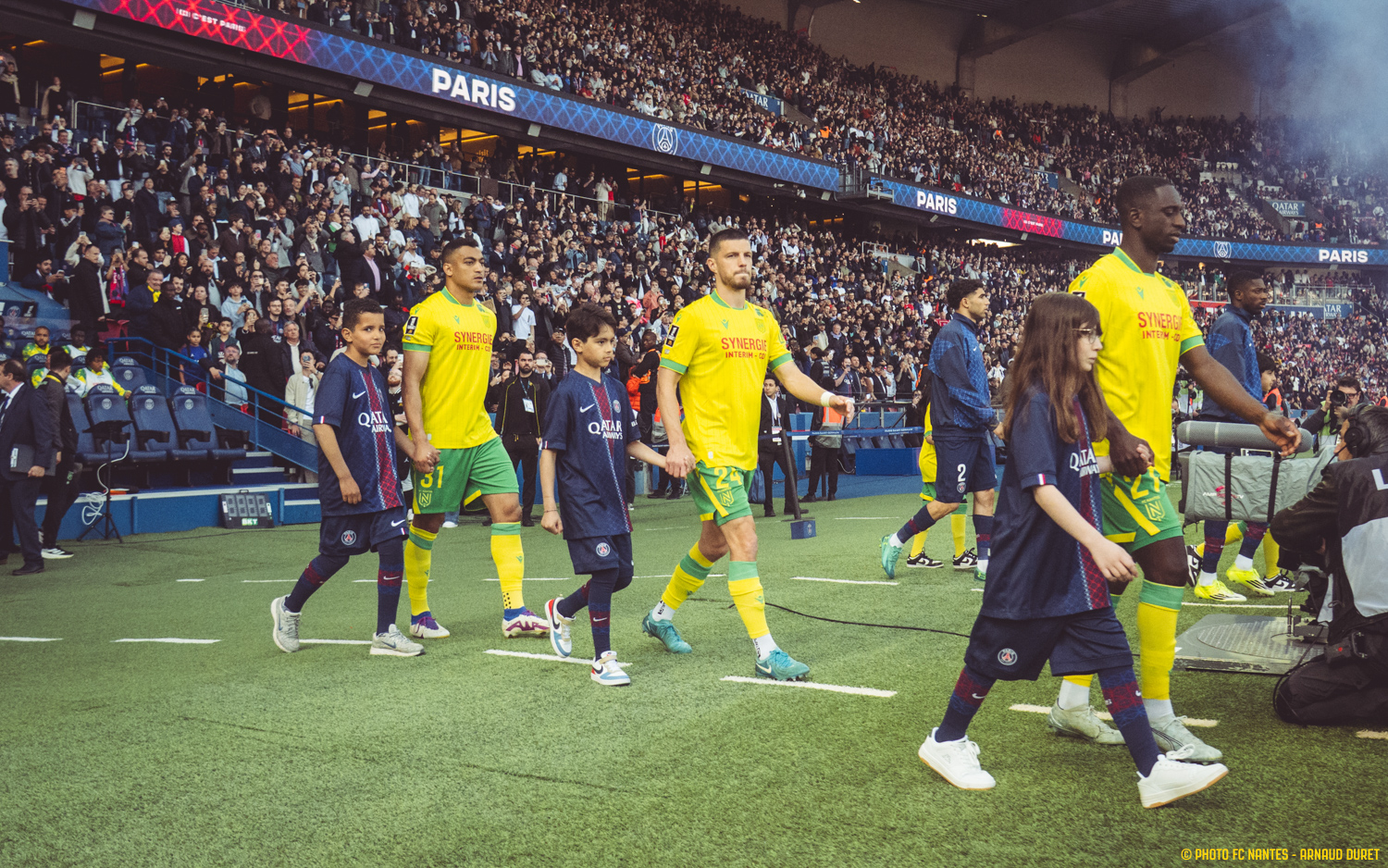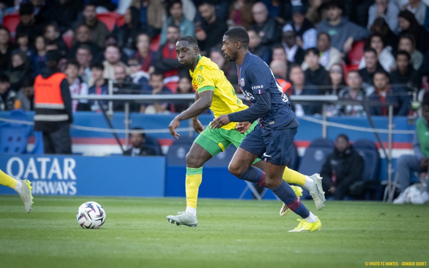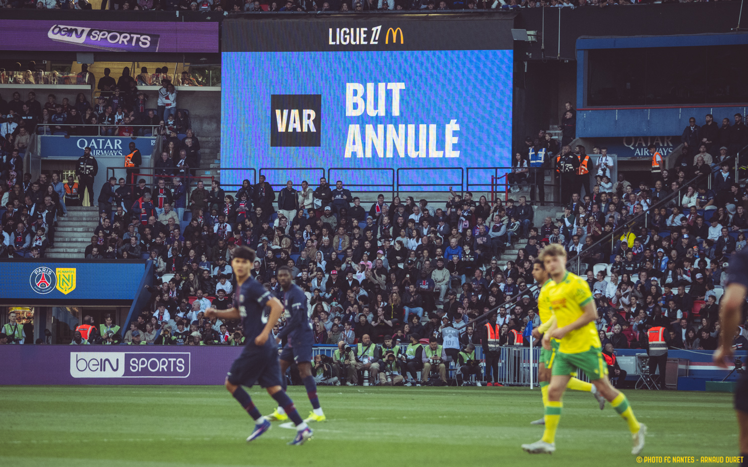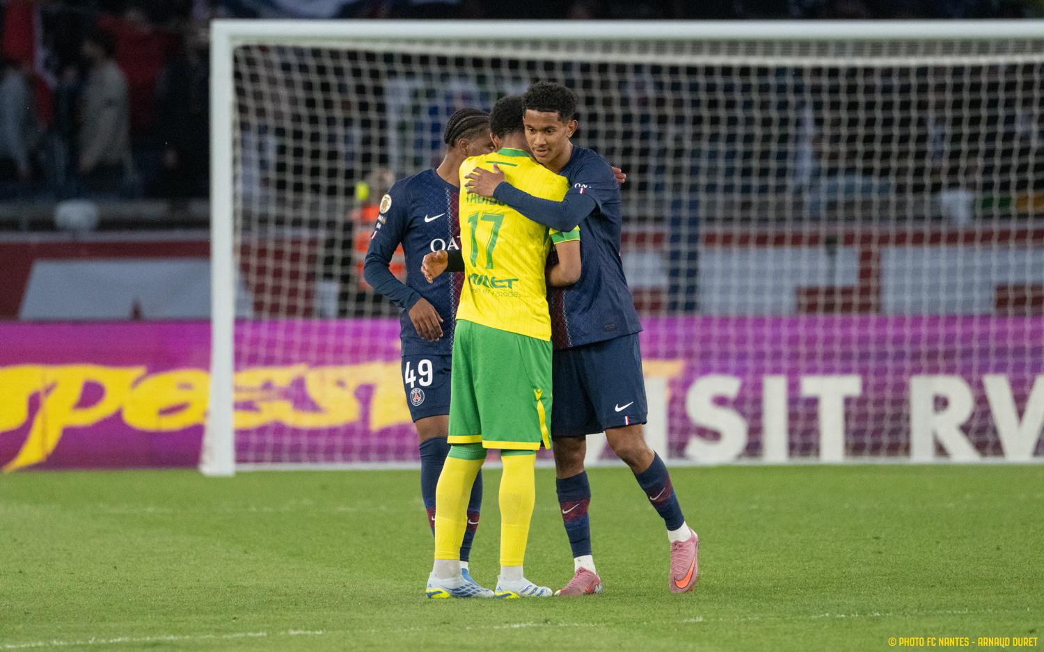 Le FC Nantes s'est incliné face au Paris SG en match reporté de la 26ème journée de L1 McDonald's (3-0). Khvicha Kvaratskhelia a ouvert la marque sur penalty dès la 13ème minute de jeu. Désiré Doué, auteur d'une frappe limpide en pleine lucarne (37e : 2-0), a doublé la mise pour le PSG qui scellait une solide prestation par le doublé de son international géorgien (50e : 3-0). Flashback en images sur la 96ème édition entre le Paris SG et le FC Nantes jouée devant près de 400 supporters des Jaunes et Verts présents au Parc des Princes.
