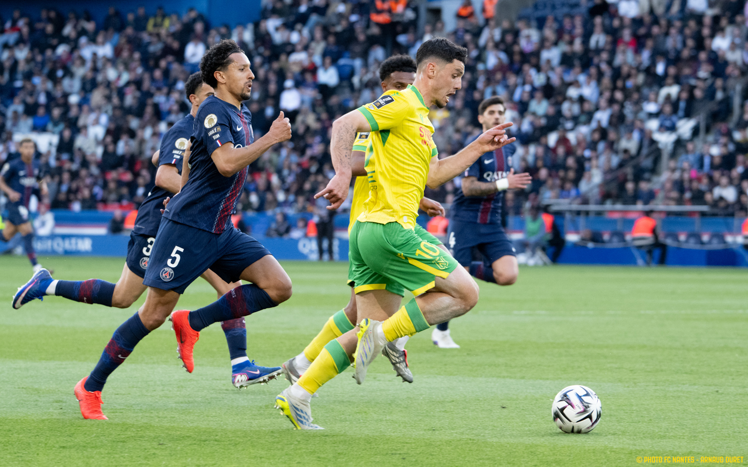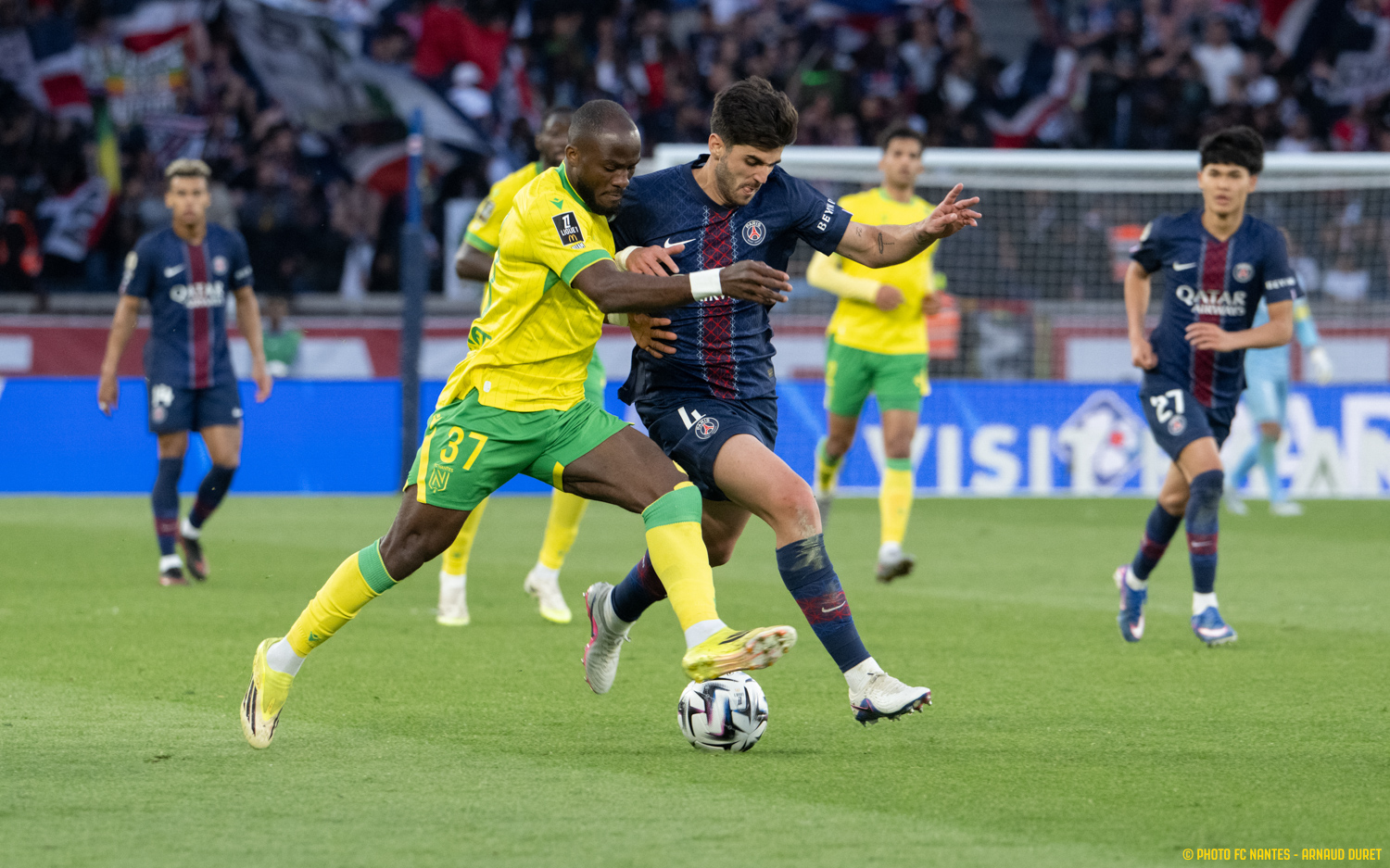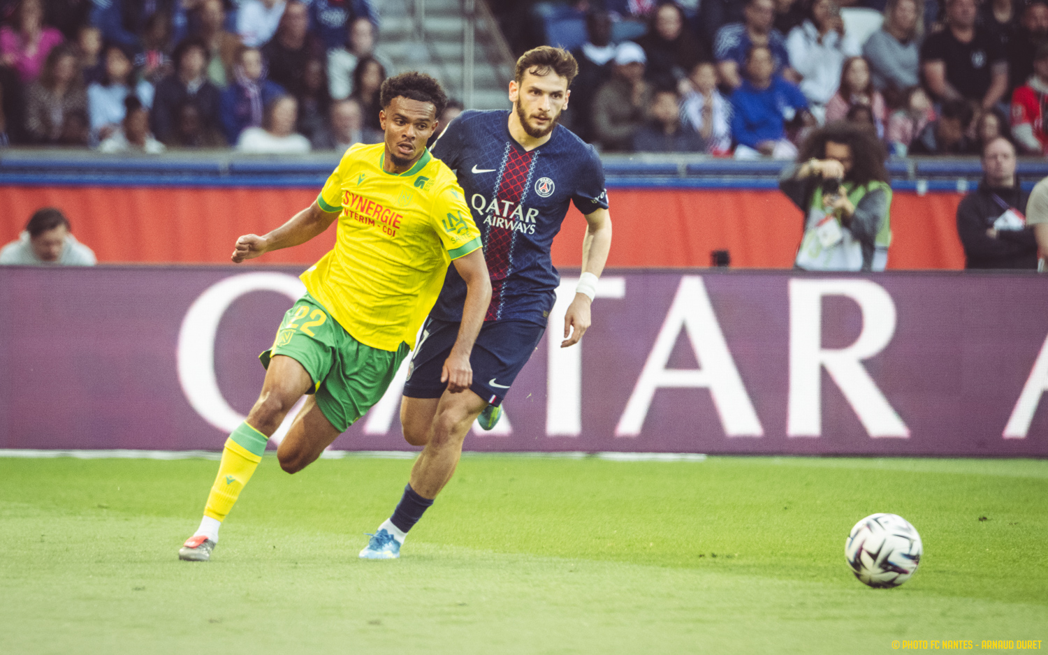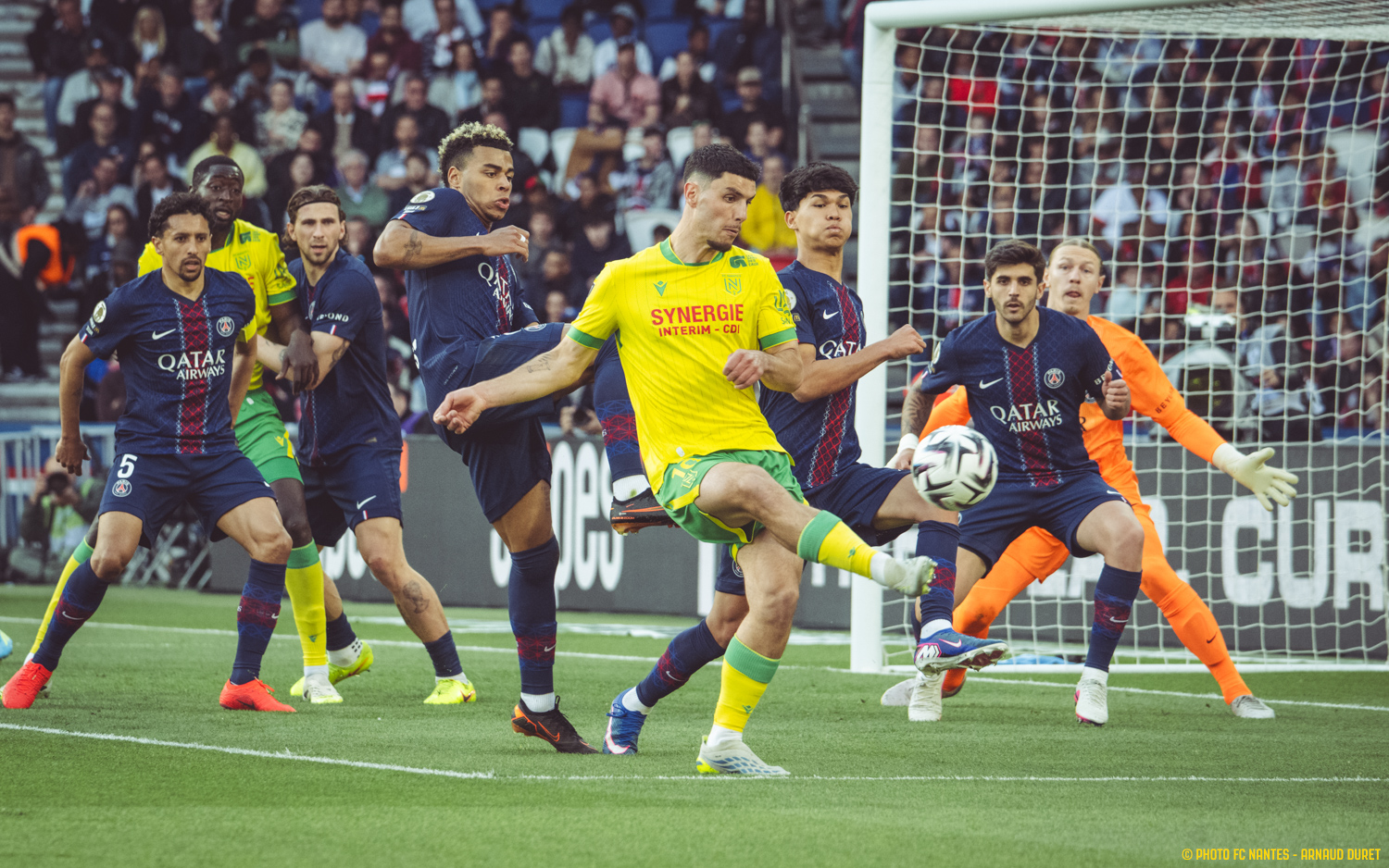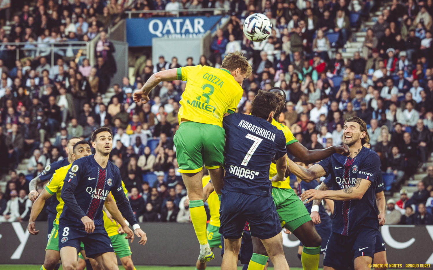 Le FC Nantes s'est incliné face au Paris SG en match reporté de la 26ème journée de L1 McDonald's (3-0). Khvicha Kvaratskhelia a ouvert la marque sur penalty dès la 13ème minute de jeu. Désiré Doué, auteur d'une frappe limpide en pleine lucarne (37e : 2-0), a doublé la mise pour le PSG qui scellait une solide prestation par le doublé de son international géorgien (50e : 3-0). Flashback en images sur la 96ème édition entre le Paris SG et le FC Nantes jouée devant près de 400 supporters des Jaunes et Verts présents au Parc des Princes.